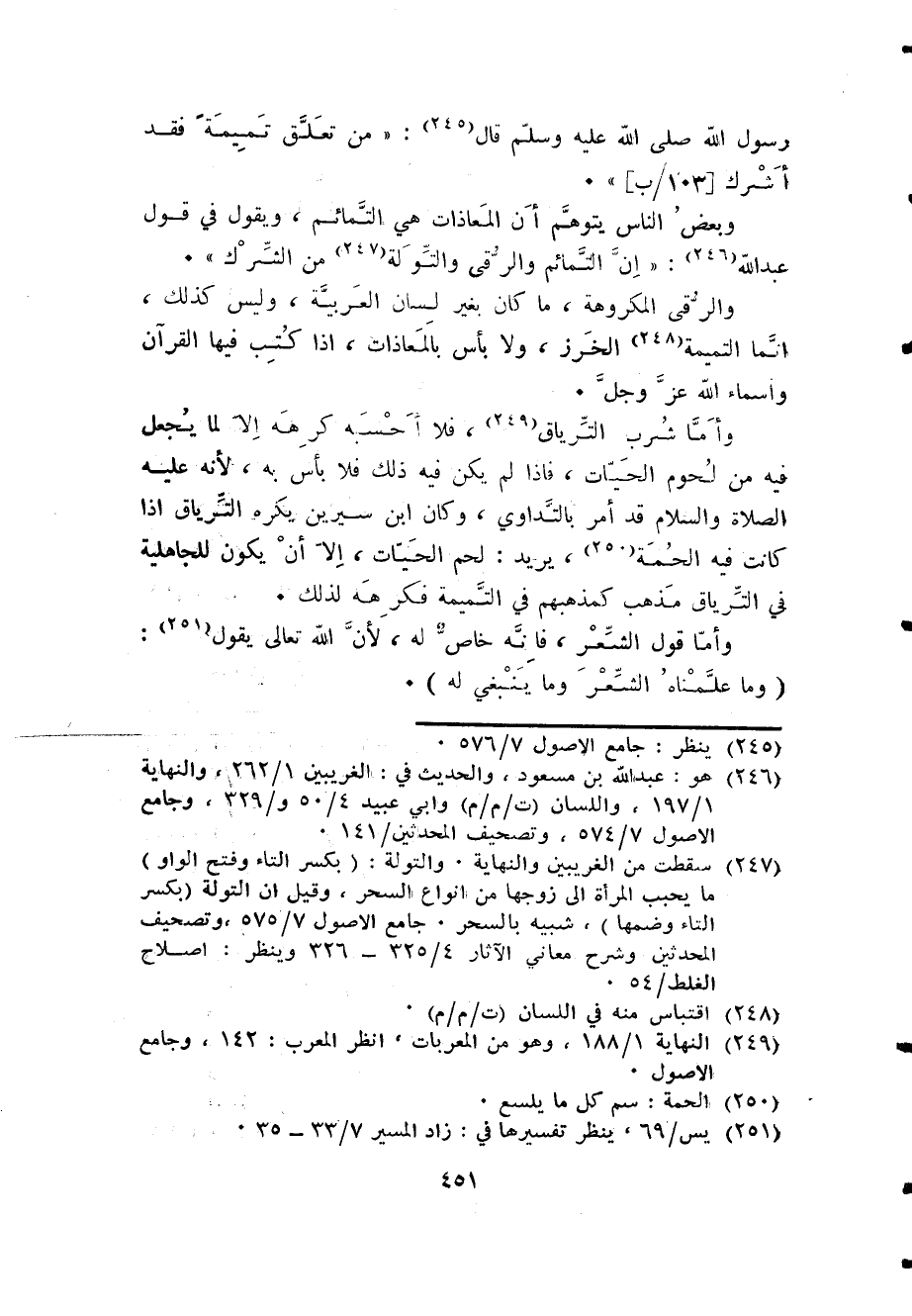 وَبَعض النَّاس يتَوَهَّم أَن المعاذات هِيَ التمائم وَيَقُول فِي قَول عبد الله إِن التمائم والرقى والتولة من الشّرك