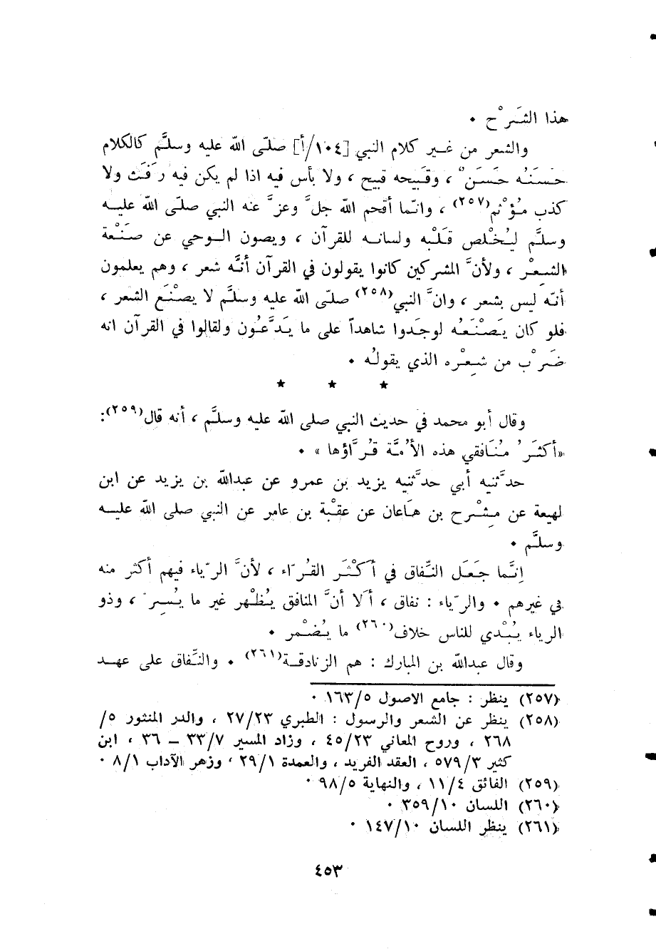 وَالشعر من غير كَلَام النَّبِي صلى الله عَلَيْهِ وَسلم كَالْكَلَامِ حسنه حسن وقبيحه قَبِيح وَلَا بَأْس فِيهِ إِذا لم يكن فِيهِ رفث وَلَا كذب مؤثم وَإِنَّمَا أقحم الله جلّ وَعز عَنهُ النَّبِي صلى الله عَلَيْهِ وَسلم ليخلص قلبه وَلسَانه لِلْقُرْآنِ ويصون الْوَحْي عَن صَنْعَة الشّعْر وَلِأَن الْمُشْركين كَانُوا يَقُولُونَ فِي الْقُرْآن أَنه شعر وهم يعلمُونَ أَنه لَيْسَ بِشعر وَأَن النَّبِي صلى الله عَلَيْهِ وَسلم لَا يصنع الشّعْر فَلَو كَانَ يصنعه لوجدوا شَاهدا على مَا يدعونَ ولقالوا فِي الْقُرْآن أَنه ضرب من شعره الَّذِي يَقُوله