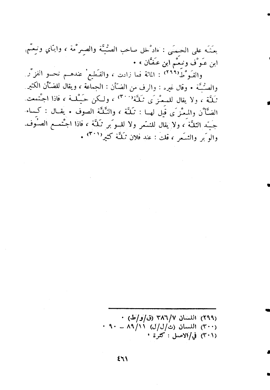 والقوط الْمِائَة فَمَا زَادَت والقطيع عِنْدهم نَحْو الفزر والصبة وَقَالَ غَيره والرف من الضَّأْن الْجَمَاعَة وَيُقَال للضأن الْكثير ثلة وَلَا يُقَال للمعزى ثلة وَلَكِن حِيلَة فَإِذا اجْتمعت الضَّأْن والمعزى قيل لَهَا ثلة والثلة الصُّوف يُقَال كسَاء جيد الثلَّة وَلَا يُقَال للشعر وَلَا للوبر ثلة فَإِذا اجْتمع الصُّوف والوبر وَالشعر قلت عِنْد فلَان ثلة كثير