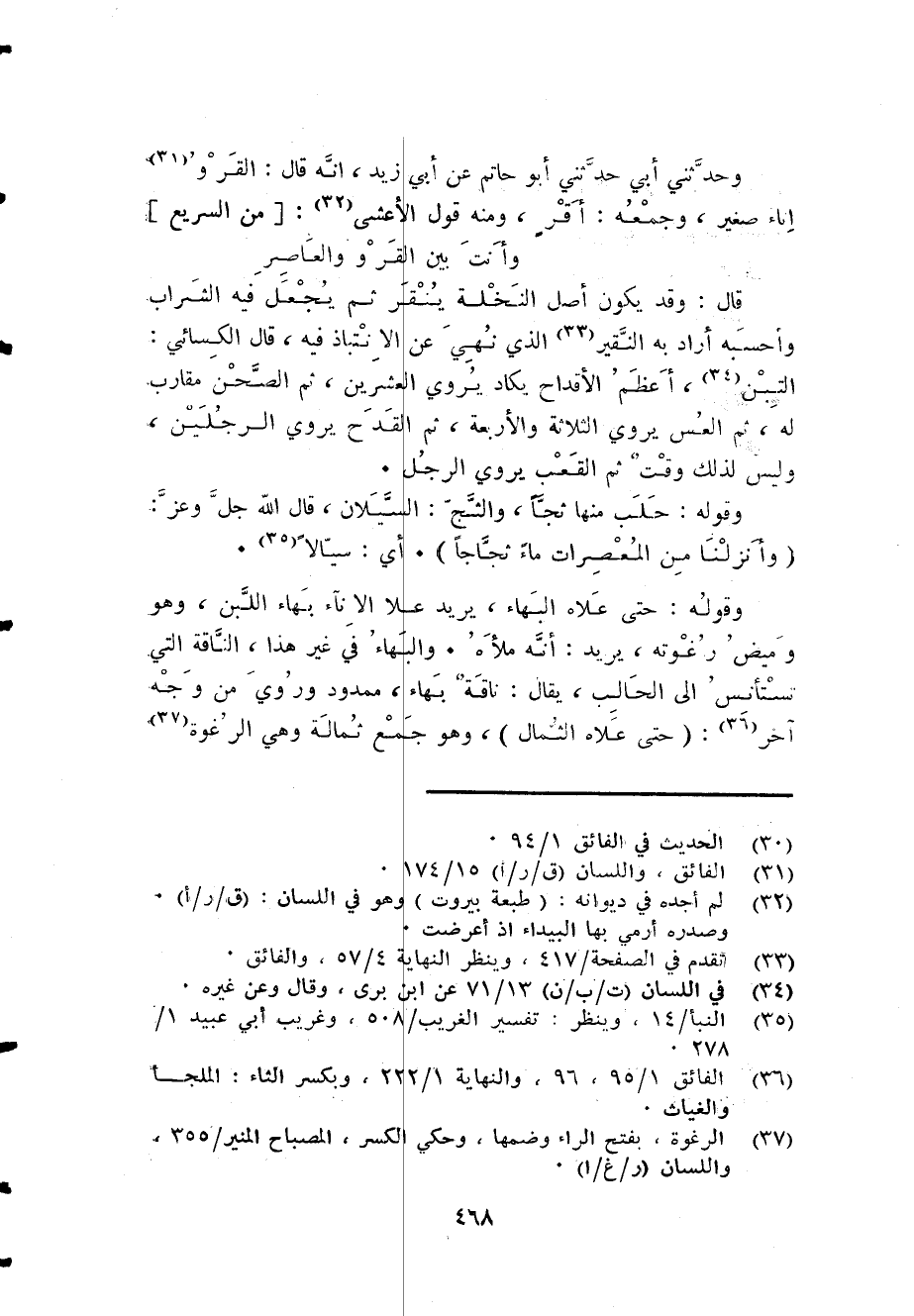 وحَدثني أبي حَدثنِي أَبُو حَاتِم عَن أبي زيد أَنه قَالَ القرو إِنَاء صَغِير وَجمعه أقرّ وَمِنْه قَول الْأَعْشَى من السَّرِيع ... وَأَنت بَين القرو والعاصر ...