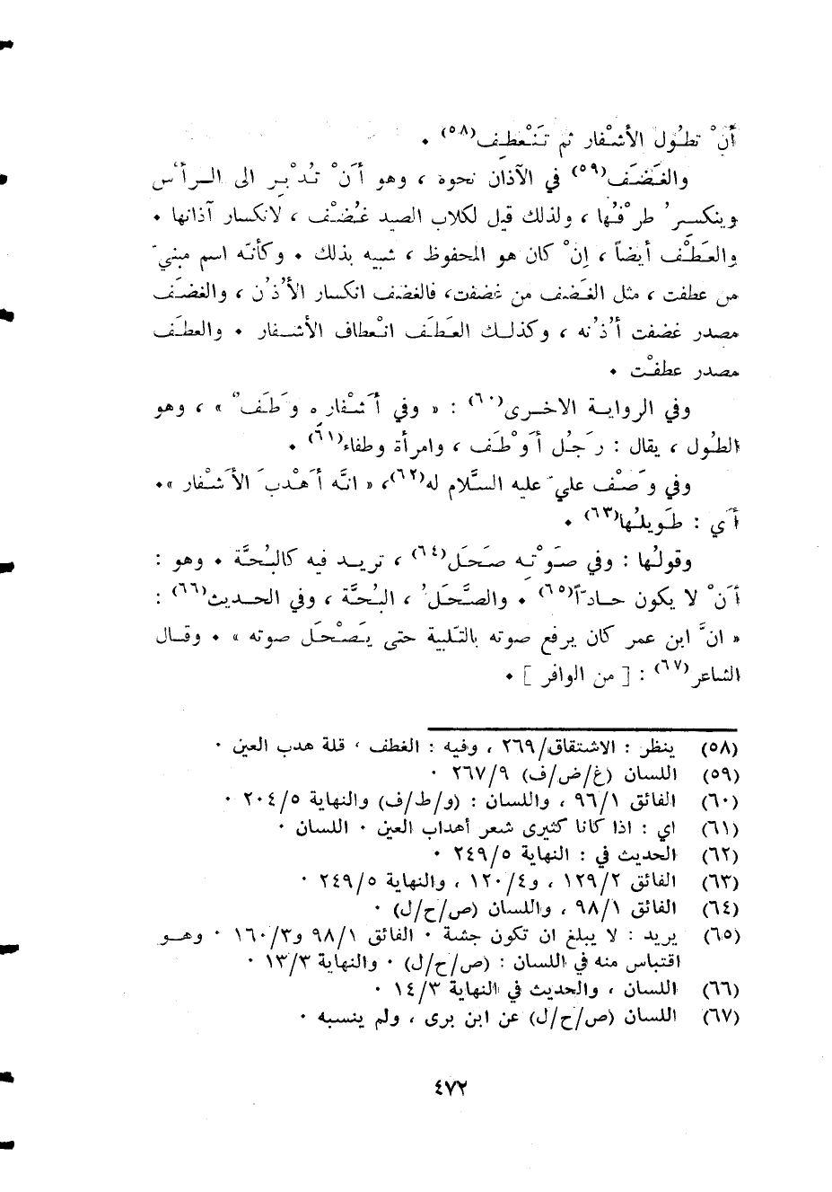 والغضف فِي الآذان نَحوه وَهُوَ أَن تدبر إِلَى الرَّأْس وينكسر طرفها وَلذَلِك قيل لكلاب الصَّيْد غضف لانكسار آذانها والعطف أَيْضا إِن كَانَ هُوَ الْمَحْفُوظ شَبيه بذلك وَكَأَنَّهُ اسْم مَبْنِيّ من عطفت مثل الغضف من غضفت فالغضف انكسار الْأذن والغضف مصدر غضفت أُذُنه وَكَذَلِكَ الْعَطف انعطاف الأشفار والعطف مصدر عطفت