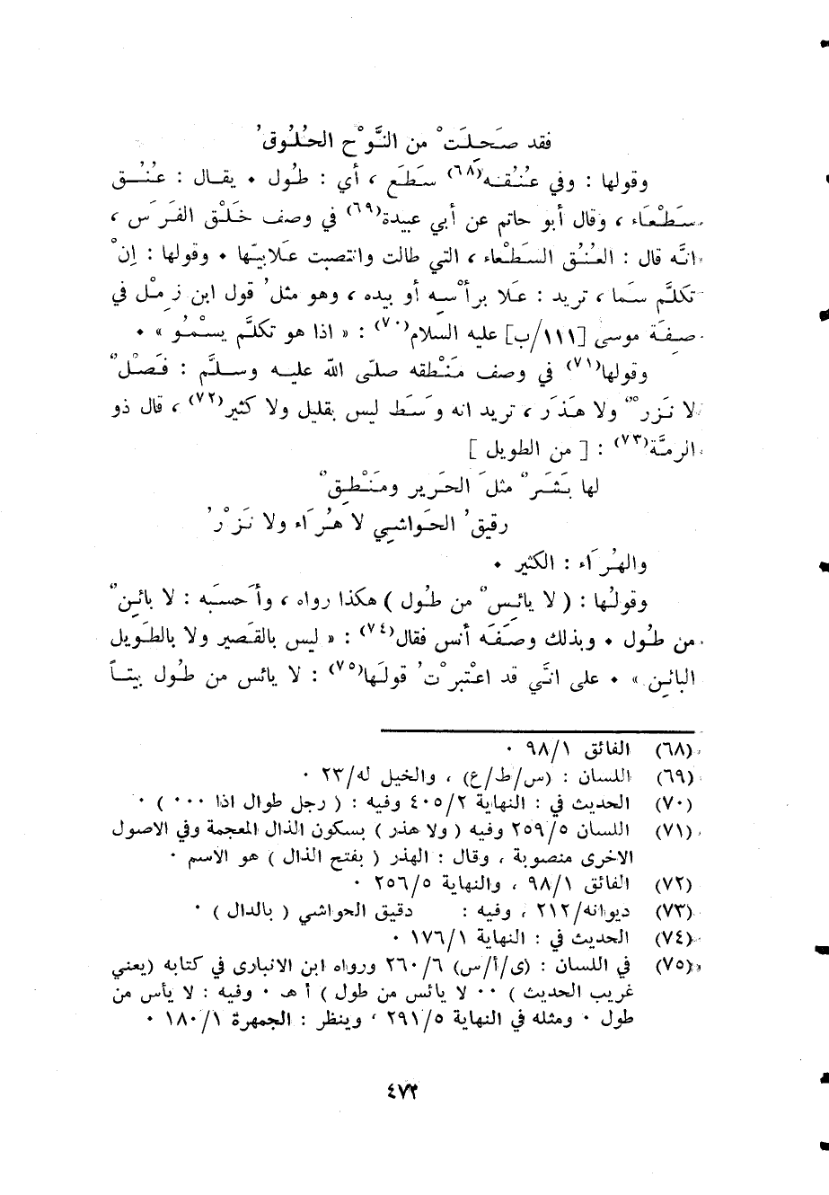 وَقَوْلها فِي وصف مَنْطِقه صلى الله عَلَيْهِ وَسلم فصل لَا نزر وَلَا هذر تُرِيدُ أَنه وسط لَيْسَ بِقَلِيل وَلَا كثير قَالَ ذُو الرمة من الطَّوِيل ... لَهَا بشر مثل الْحَرِير ومنطق ... رَقِيق الْحَوَاشِي لَا هراء وَلَا نزر ...