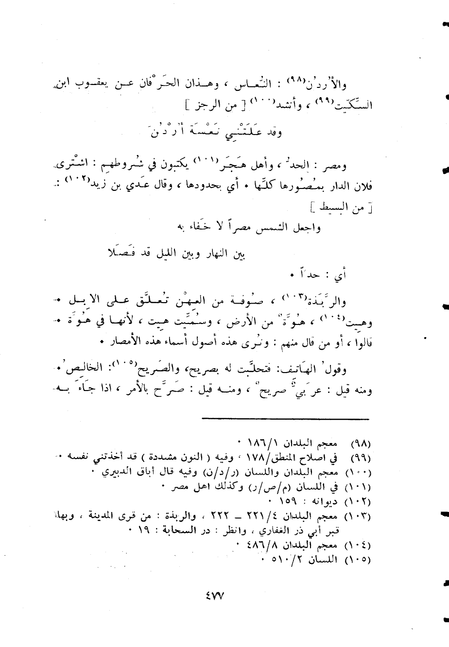ومصر الْحَد وَأهل هجر يَكْتُبُونَ فِي شروطهم اشْترى فلَان الدَّار بمصورها كلهَا أَي بحدودها وَقَالَ عدي بن زيد [من الْبَسِيط] ... وَاجعَل الشَّمْس مصرا لَا خَفَاء بِهِ ... بَين النَّهَار وَبَين اللَّيْل قد فصلا ...
