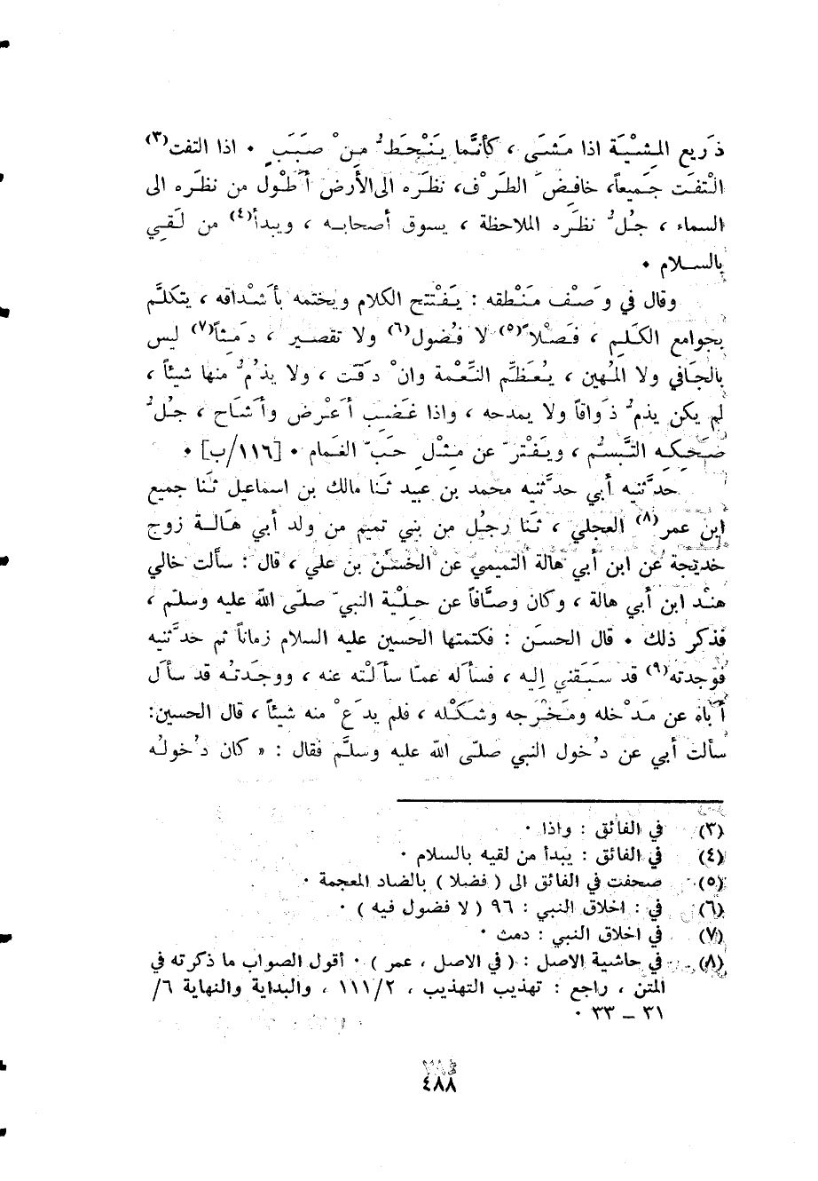 ذريع المشية اذا مَشى كانما ينحط من صبب اذا الْتفت الْتفت جَمِيعًا خافض الطّرف نظره الى الأَرْض أطول من نظره الى السَّمَاء جلّ نظره الملاحظة يَسُوق أَصْحَابه وَيبدأ من لَقِي بِالسَّلَامِ.