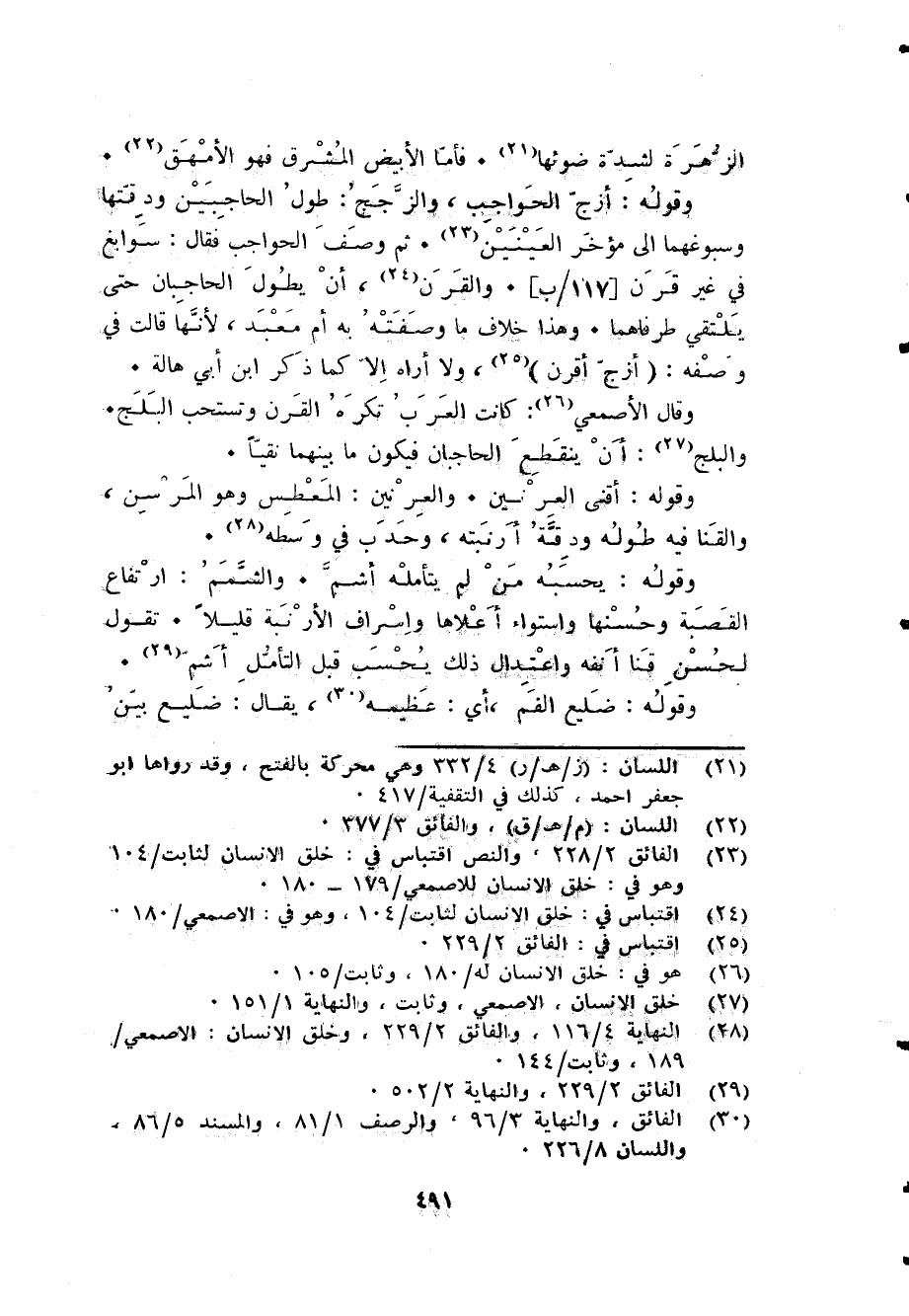 وَقَوله أَزجّ الحواجب والزجج طول الحاجبين ودقتها وسبوغهما إِلَى مُؤخر الْعَينَيْنِ ثمَّ وصف الحواجب فَقَالَ سوابغ فِي غير قرن والقرن أَن يطول الحاجبان حَتَّى يلتقي طرفاهما وَهَذَا خلاف مَا وَصفته بِهِ أم معبد لِأَنَّهَا قَالَت فِي وَصفه أَزجّ أقرن وَلَا أرَاهُ إِلَّا كَمَا ذكر ابْن أبي هَالة