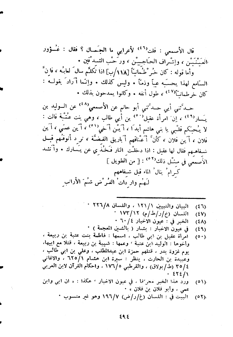 حَدثنِي أبي حَدثنِي أَبُو حَاتِم عَن الْأَصْمَعِي عَن الْوَلِيد بن يسَار ان امْرَأَة عقيل بن أبي طَالب وَهِي بنت عتبَة قَالَت لَا يحبكم قلبِي يَا بني هَاشم أبدا أَيْن أخي أَيْن عمي أَيْن فلَان أَيْن فلَان كَأَن أَعْنَاقهم أَبَارِيق الْفضة ترد أنوفهم قبل شفاههم فَقَالَ لَهَا عقيل اذا دخلت النَّار فَخذي عَن يسارك وَأنْشد الْأَصْمَعِي فِي مثل ذَلِك [من الطَّوِيل] ... كرام ينَال المَاء قبل شفاههم ... لَهُم واردات الْغَرَض شم الأرانب ...