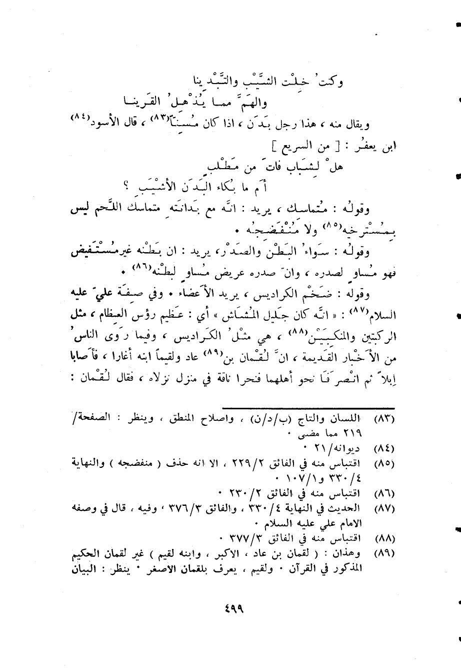 وَقَوله ضخم الكراديس يُرِيد الْأَعْضَاء وَفِي صفة عَليّ عَلَيْهِ السَّلَام: انه كَانَ جليل المشاش أَي عَظِيم رُؤْس الْعِظَام مثل الرُّكْبَتَيْنِ والمنكبين هِيَ مثل الكراديس وَفِيمَا روى النَّاس من الْأَخْبَار الْقَدِيمَة ان لُقْمَان بن عَاد ولقيما ابْنه أغارا فأصابا ابلا ثمَّ انصرفا نَحْو أهلهما فنحرا نَاقَة فِي منزل نزلاه فَقَالَ لُقْمَان