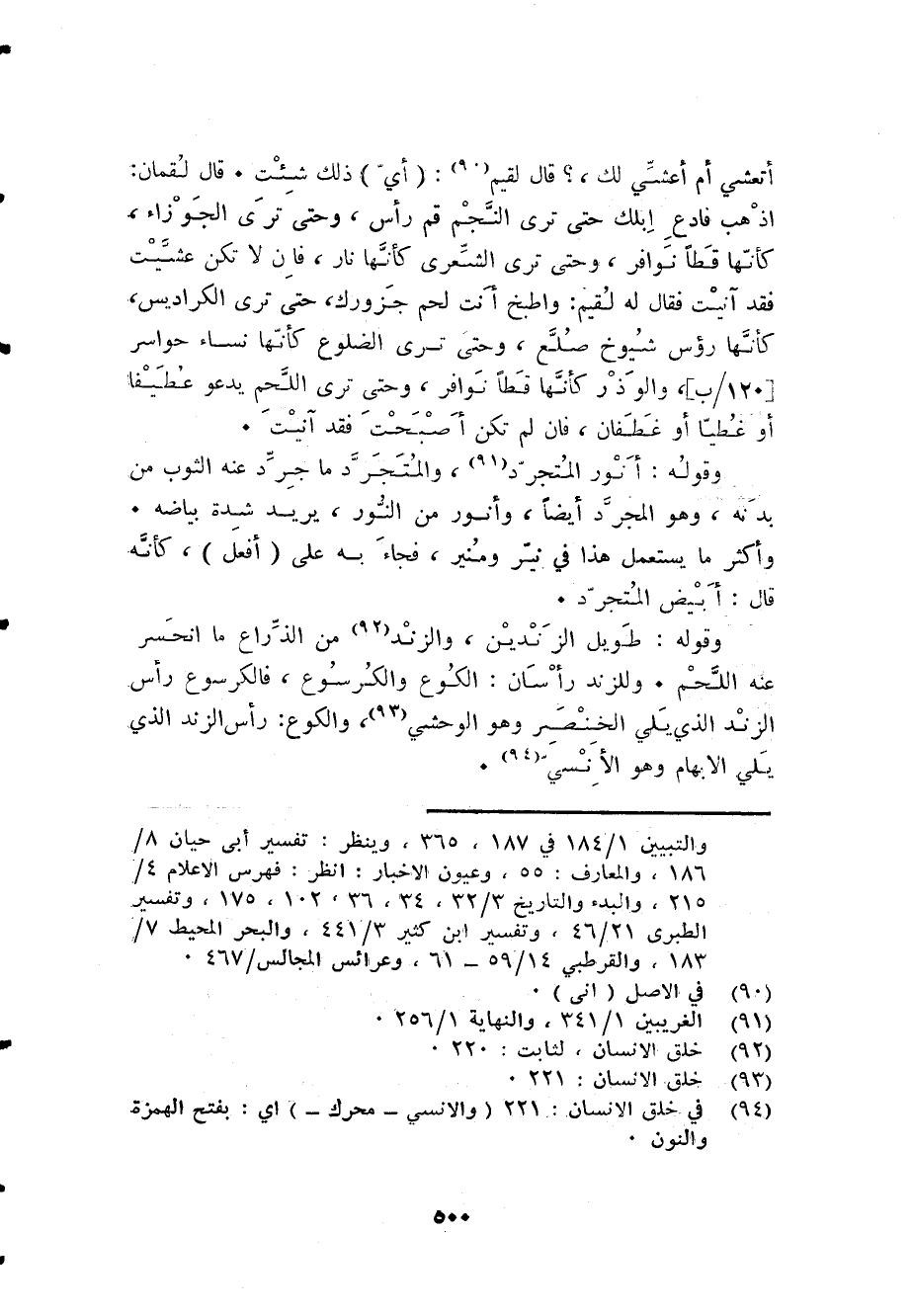 أتعشي أم أعشي لَك قا لقيم أَي ذَلِك شِئْت قَالَ لُقْمَان اذْهَبْ فَادع إبلك حَتَّى ترى النَّجْم قُم رَأس وَحَتَّى ترى الجوزاء كَأَنَّهَا قطا نوافر وَحَتَّى ترى الشعرى كَأَنَّهَا نَار فَإِن لَا تكن عشيت فقد آنيت فَقَالَ لَهُ لقيم واطبخ أَنْت لحم جزورك حَتَّى ترى الكراديس كَأَنَّهَا رُؤْس شُيُوخ صلع وَحَتَّى ترى الضلوع كَأَنَّهَا نسَاء حواسر والوذر كَأَنَّهَا قطا نوافر وَحَتَّى ترى اللَّحْم يَدْعُو عطيفا أَو غطيا أَو غطفان فَإِن لم تكن أَصبَحت فقد آنيت