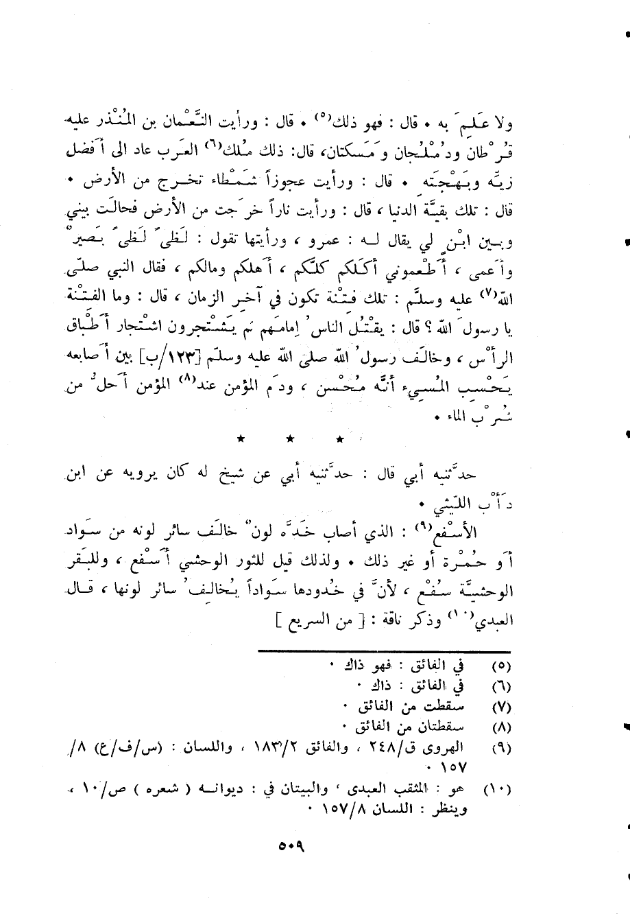 وَلَا علم بِهِ قَالَ فَهُوَ ذَلِك قَالَ وَرَأَيْت النُّعْمَان بن الْمُنْذر عَلَيْهِ قرطان ودملجان ومسكتان قَالَ ذَلِك ملك الْعَرَب عَاد إِلَى أفضل زيه وبهجته قَالَ وَرَأَيْت عجوزا شَمْطَاء تخرج من الأَرْض قَالَ تِلْكَ بَقِيَّة الدُّنْيَا قَالَ وَرَأَيْت نَارا خرجت من الأَرْض فحالت بيني وَبَين ابْن لي يُقَال لَهُ عَمْرو ورأيتها تَقول لظى لظى بَصِير وأعمى أَطْعمُونِي أكلكم كلكُمْ أهلكم ومالكم فَقَالَ النَّبِي صلى الله عَلَيْهِ وَسلم تِلْكَ فتْنَة تكون فِي آخر الزَّمَان قَالَ وَمَا الْفِتْنَة يَا رَسُول الله قَالَ يقتل النَّاس إمَامهمْ ثمَّ يشتجرون اشتجار أطباق الرَّأْس وَخَالف رَسُول الله صلى الله عَلَيْهِ وَسلم بَين أَصَابِعه يحْسب الْمُسِيء أَنه محسن وَدم الْمُؤمن عِنْد الْمُؤمن أحل من شرب المَاء