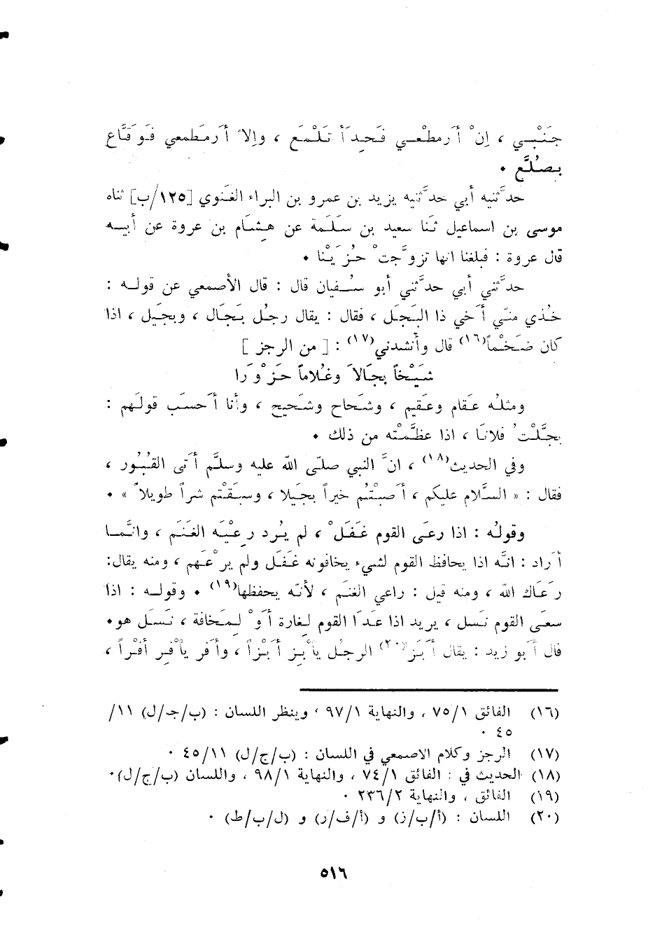 حَدثنِي أبي حَدثنِي أَبُو سُفْيَان قَالَ قَالَ الْأَصْمَعِي عَن قَوْله خذي مني أخي ذَا البجل فَقَالَ يُقَال رجل بجال وبجيل إِذا كَانَ ضخما قَالَ وأنشدني [من الرجز] ... شَيخا بجالا وَغُلَامًا حزورا ...