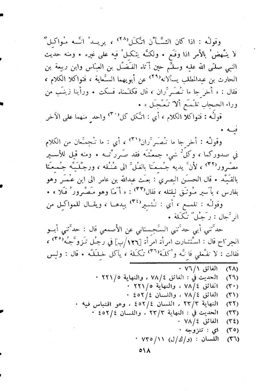 وَقَوله إِذا كَانَ الشَّأْن اتكل يُرِيد انه مواكل لَا ينْهض بِالْأَمر إِذا وَقع وَلكنه يتكل فِيهِ على غَيره وَمِنْه حَدِيث النَّبِي صلى الله عَلَيْهِ وَسلم حِين أَتَاهُ الْفضل بن الْعَبَّاس وَابْن ربيعَة بن الْحَارِث بن عبد المطلب يسألانه عَن أبويهما السّعَايَة فتواكلا الْكَلَام فَقَالَ أخرجَا مَا تصرران قَالَ فكلمناه فَسكت ورأينا زَيْنَب من وَرَاء الْحجاب تلمع أَلا تعجل