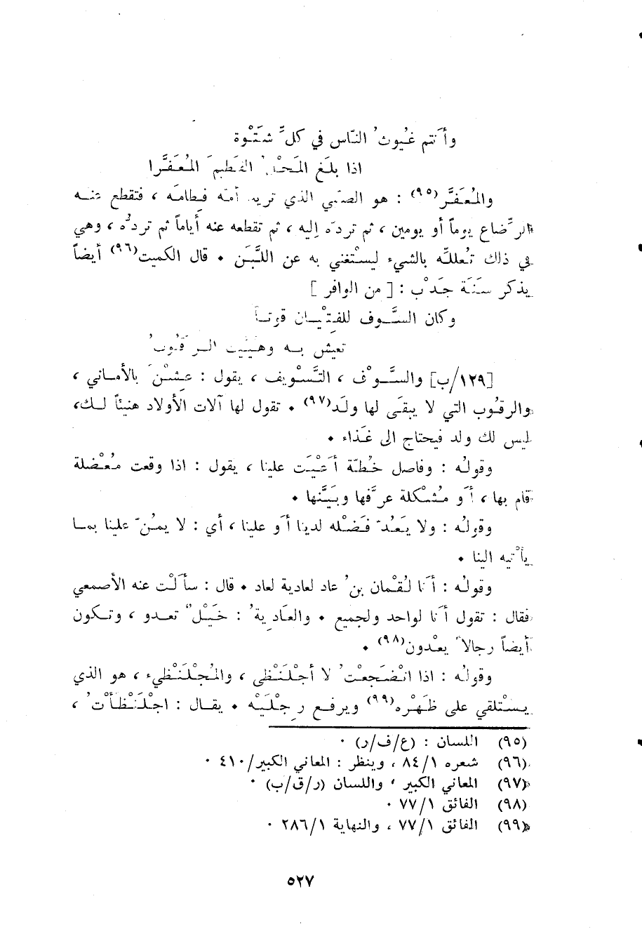 والمعفر هُوَ الصَّبِي الَّذِي تُرِيدُ أمه فطامه فتقطع عَنهُ الرَّضَاع يَوْمًا أَو يَوْمَيْنِ ثمَّ ترده إِلَيْهِ ثمَّ تقطعه عَنهُ أَيَّامًا ثمَّ ترده وَهِي فِي ذَلِك تعلله بالشَّيْء ليستغني بِهِ عَن اللَّبن قَالَ الْكُمَيْت أَيْضا يذكر سنة جَدب [من الوافر] ... وَكَانَ السوف للفتيان قوتا ... تعيش بِهِ وهييت الرقوب ...