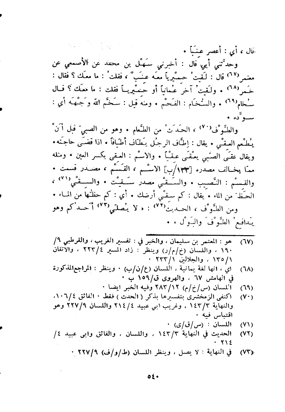 وحَدثني أبي قَالَ أَخْبرنِي سهل بن مُحَمَّد عَن الْأَصْمَعِي عَن مُعْتَمر قَالَ لقِيت حميريا مَعَه عِنَب فَقلت مَا مَعَك فَقَالَ خمر وَلَقِيت آخر عمانيا أَو حميريا فَقلت مَا مَعَك قَالَ سخام والسخام الفحم وَمِنْه قيل سخم الله وَجهه أَي سوده