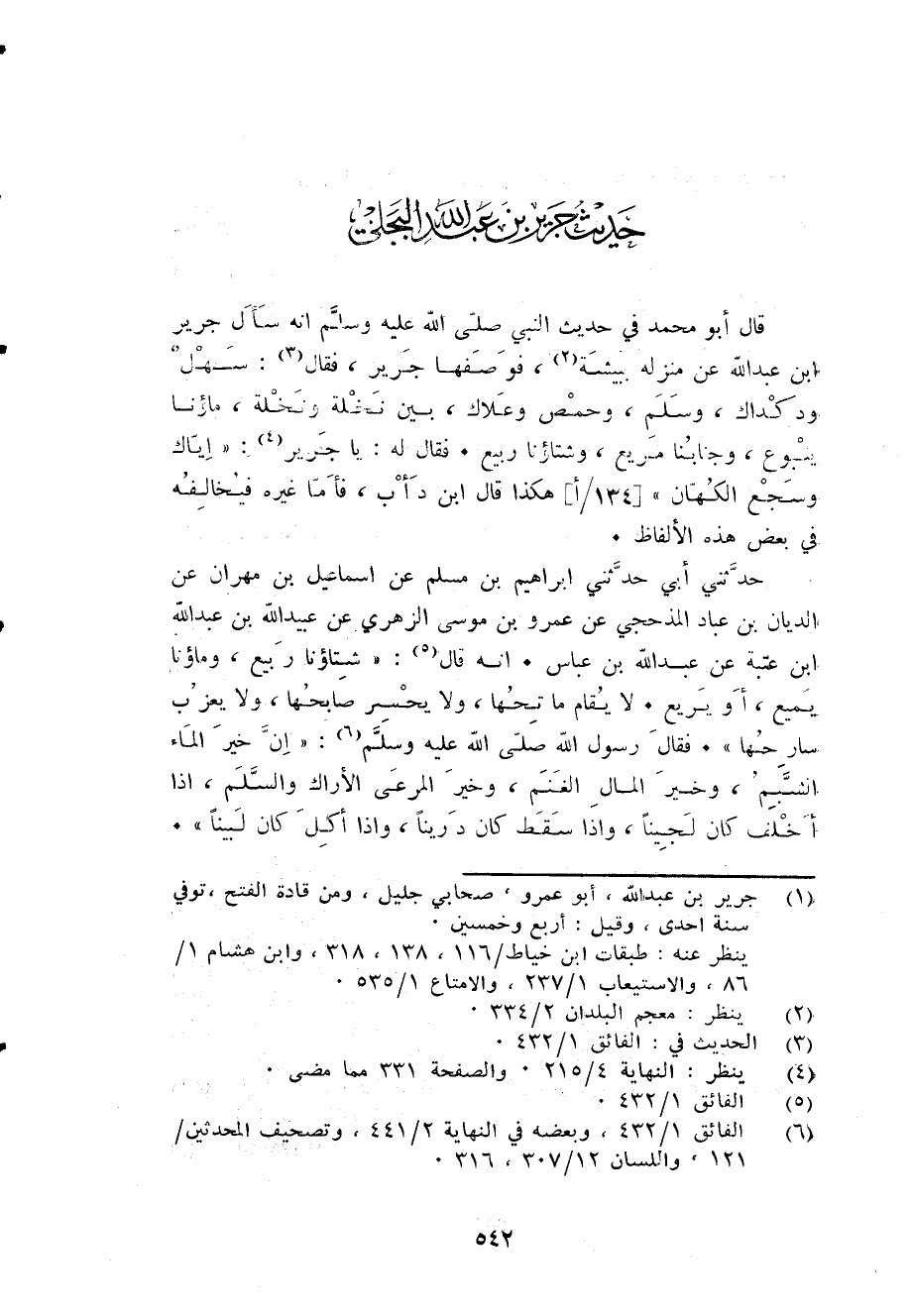 قَالَ أَبُو مُحَمَّد فِي حَدِيث النَّبِي صلى الله عَلَيْهِ وَسلم أَنه سَأَلَ جرير ابْن عبد الله عَن منزله ببيشة فوصفها جرير فَقَالَ سهل ودكداك وَسلم وحمص وعلاك بَين نَخْلَة ونخلة ماؤنا ينبوع وجنابنا مريع وشتاؤنا ربيع فَقَالَ لَهُ يَا جرير إياك وسجع الْكُهَّان هَكَذَا قَالَ ابْن دأب فَأَما غَيره فيخالفه فِي بعض هَذِه الْأَلْفَاظ