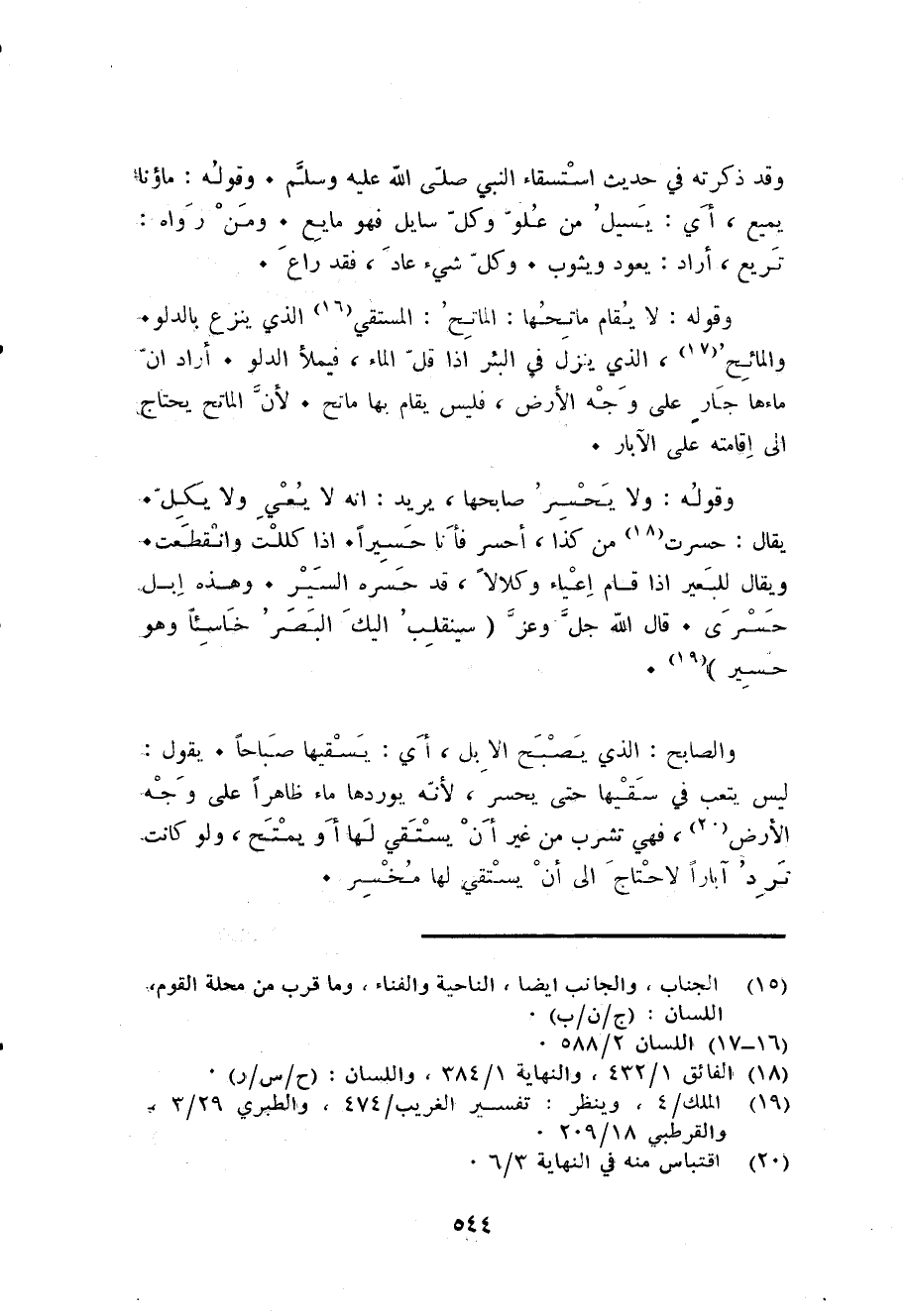 والصابح الَّذِي يصبح الْإِبِل أَي يسقيها صباحا يَقُول لَيْسَ يتعب فِي سقيها حَتَّى يحسر لِأَنَّهُ يوردها مَاء ظَاهرا على وَجه الأَرْض فَهِيَ تشرب من غير أَن يَسْتَقِي لَهَا أَو يمتح وَلَو كَانَت ترد آبارا لاحتاج إِلَى أَن يَسْتَقِي لَهَا مخسر