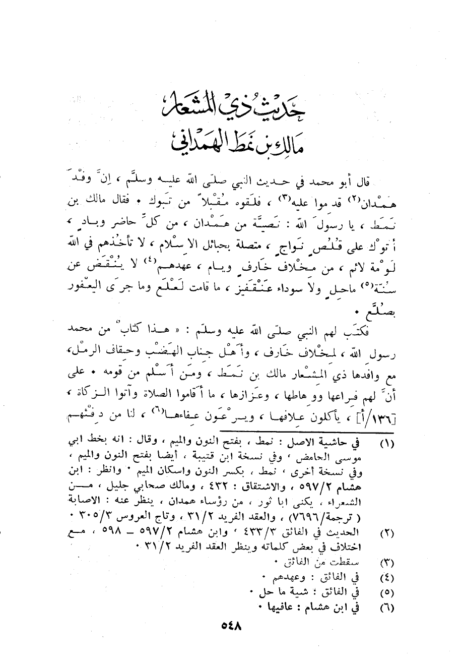 فَكتب لَهُم النَّبِي صلى الله عَلَيْهِ وَسلم هَذَا كتاب من مُحَمَّد رَسُول الله لمخلاف خارف وَأهل جناب الهضب وحقاف الرمل مَعَ وافدها ذِي المشعار مَالك بن نمط وَمن أسلم من قومه على أَن لَهُم فراعها ووهاطها وعزازها مَا أَقَامُوا الصَّلَاة وَآتوا الزَّكَاة يَأْكُلُون علافها ويرعون عفاءها لنا من دفئهم