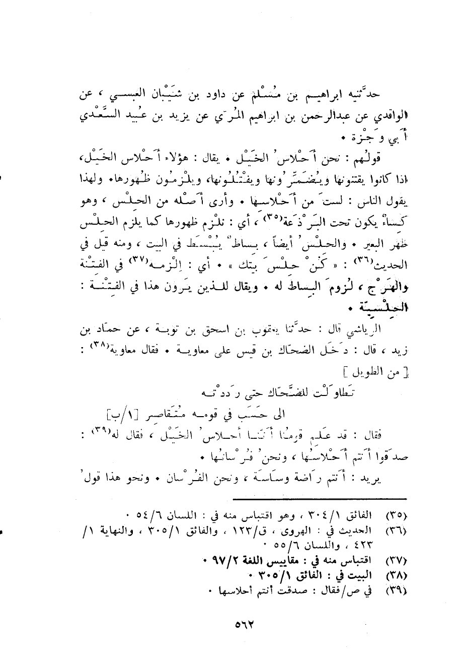 قَوْلهم نَحن أحلاس الْخَيل يُقَال هَؤُلَاءِ أحلاس الْخَيل إِذا كَانُوا يقتنونها ويضمرونها ويفتلونها ويلزمون ظُهُورهَا وَلِهَذَا يَقُول النَّاس لس من أحلاسها وَأرى أَصله من الحلس وَهُوَ كسَاء يكون تَحت البرذعة أَي نلزم ظُهُورهَا كَمَا يلْزم الحلس ظهر الْبَعِير والحلس أَيْضا بِسَاط يبسط فِي الْبَيْت وَمِنْه قيل فِي الحَدِيث كن حلْس بَيْتك أَي إلزمه فِي الْفِتْنَة والهرج لُزُوم الْبسَاط لَهُ وَيُقَال للَّذين يرَوْنَ هَذَا فِي الْفِتْنَة الحلسية