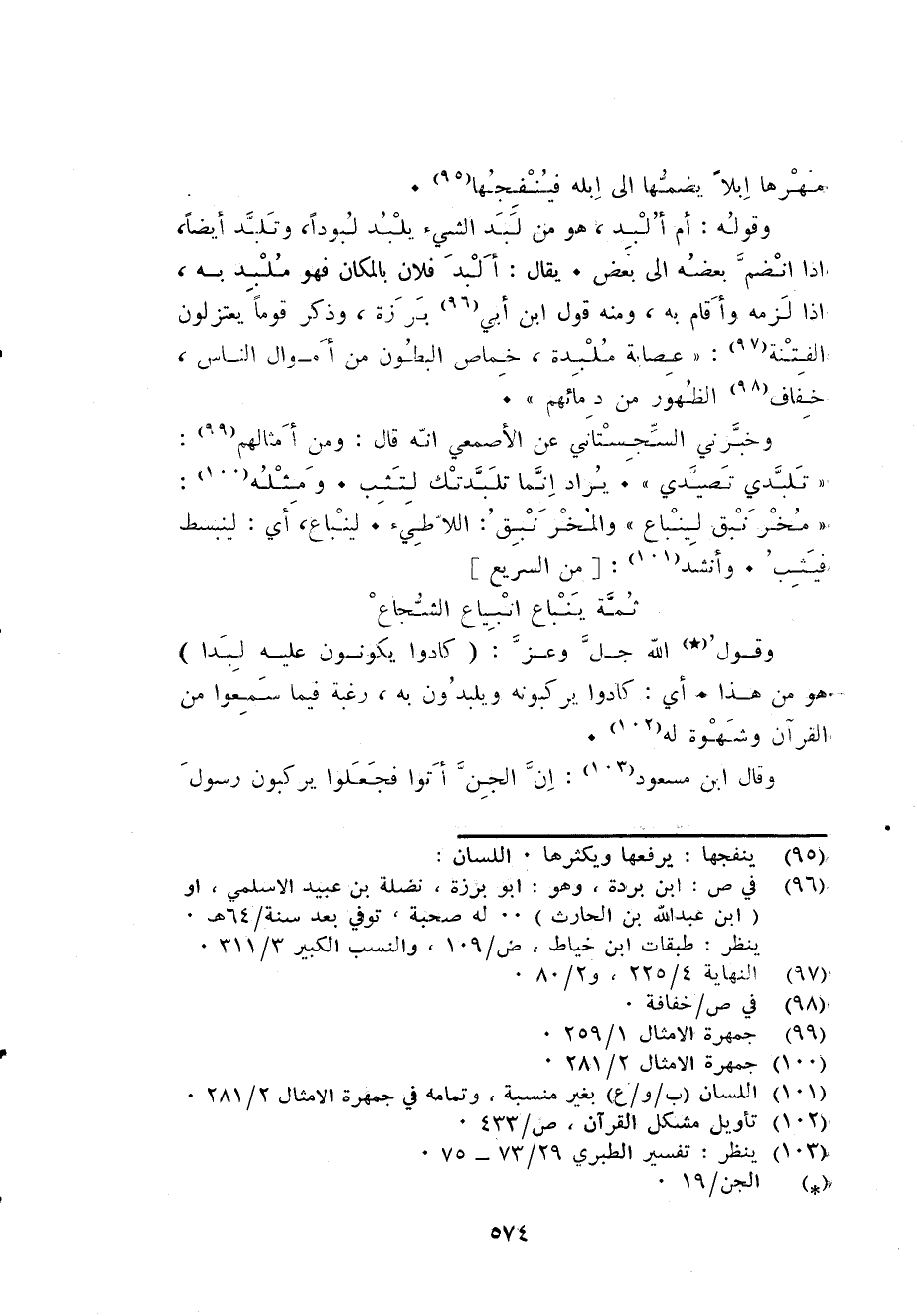 وَقَوله أم ألبد هُوَ من لبد الشَّيْء يلبد لبودا وَتَلَبَّدَ أَيْضا اذا انْضَمَّ بعضه الى بعض يُقَال ألبد فلَان بِالْمَكَانِ فَهُوَ ملبد بِهِ اذا لزمَه وَأقَام بِهِ وَمِنْه قَول ابْن أبي بَرزَة وَذكر قوما يعتزلون الْفِتْنَة عِصَابَة ملبدة خماص الْبُطُون من أَمْوَال النَّاس خفاف الظُّهُور من دِمَائِهِمْ.