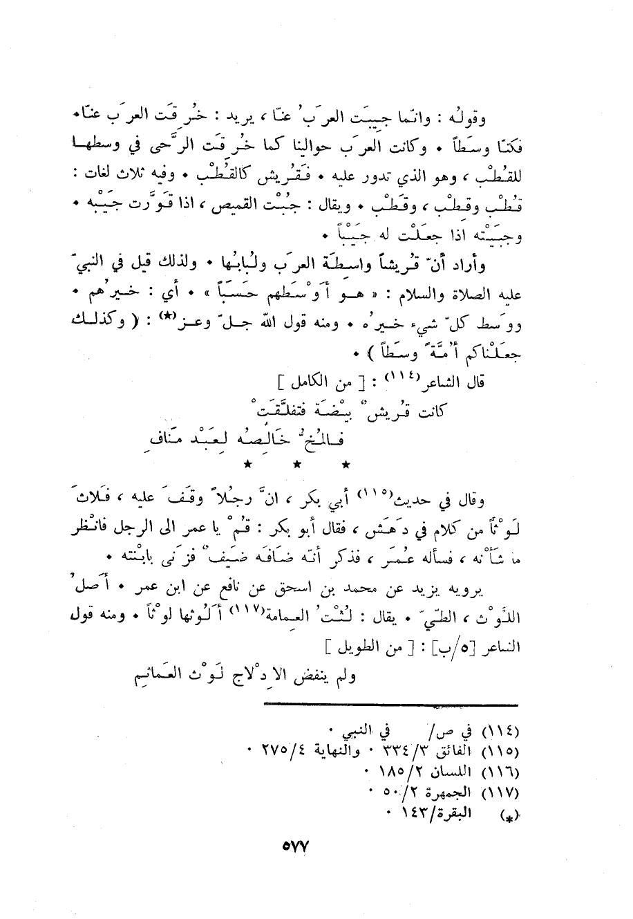 وَأَرَادَ أَن قُريْشًا وَاسِطَة الْعَرَب ولبابها وَلذَلِك قيل فِي النَّبِي عَلَيْهِ الصَّلَاة وَالسَّلَام هُوَ أوسطهم حسبا أَي خَيرهمْ ووسط كل شَيْء خَيره وَمِنْه قَول الله جلّ وَعز: {وَكَذَلِكَ جَعَلْنَاكُمْ أمة وسطا} . قَالَ الشَّاعِر [من الْكَامِل] ... كَانَت قُرَيْش بَيْضَة فتفلقت ... فالمخ خالصه لعبد منَاف ...
