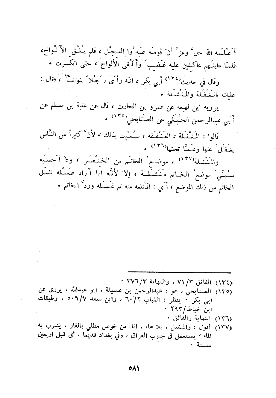 وَقَالَ فِي حَدِيث أبي بكر أَنه رأى رجلا يتَوَضَّأ فَقَالَ عَلَيْك بالمغفلة والمنشلة