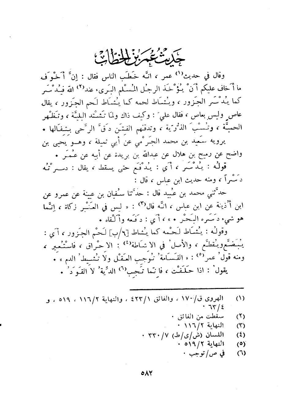 وَقَالَ فِي حَدِيث عمر أَنه خطب النَّاس فَقَالَ إِن أخوف مَا أَخَاف عَلَيْكُم أَن يُؤْخَذ الرجل الْمُسلم البريء عِنْد الله فيدسر كَمَا يدسر الْجَزُور ويشاط لَحْمه كَمَا يشاط لحم الْجَزُور يُقَال عَاص وَلَيْسَ بعاص فَقَالَ عَليّ وَكَيف ذَاك وَلما تشتد البلية وَتظهر الحمية وتسب الذُّرِّيَّة وتدقهم الْفِتَن دق الرَّحَى بثفالها