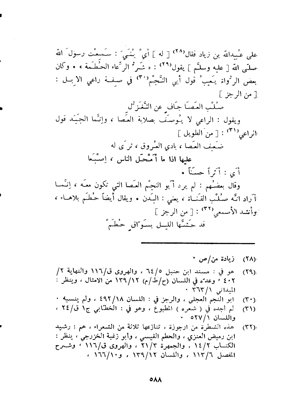 على عبيد الله بن زِيَاد فَقَالَ لَهُ أَي بني سَمِعت رَسُول الله صلى الله عَلَيْهِ وَسلم يَقُول شَرّ الرعاء الحطمة وَكَانَ بعض الروَاة يعيب قَول أبي النَّجْم فِي صفة راعي الْإِبِل [من الرجز] ... صلب الْعَصَا جَاف عَن التغزل ...