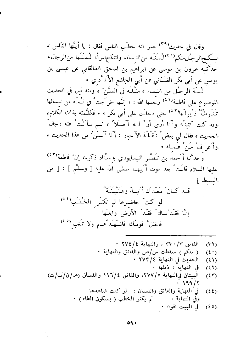 وَحدثنَا أَحْمد بن نصر النَّيْسَابُورِي بِإِسْنَاد ذكره إِن فَاطِمَة عَلَيْهَا السَّلَام قَالَت بعد موت أَبِيهَا صلى الله عَلَيْهِ وَسلم [من الْبَسِيط] ... قد كَانَ بعْدك أنباء وهنبثة ... لَو كنت حاضرها لم تكْثر الْخطب