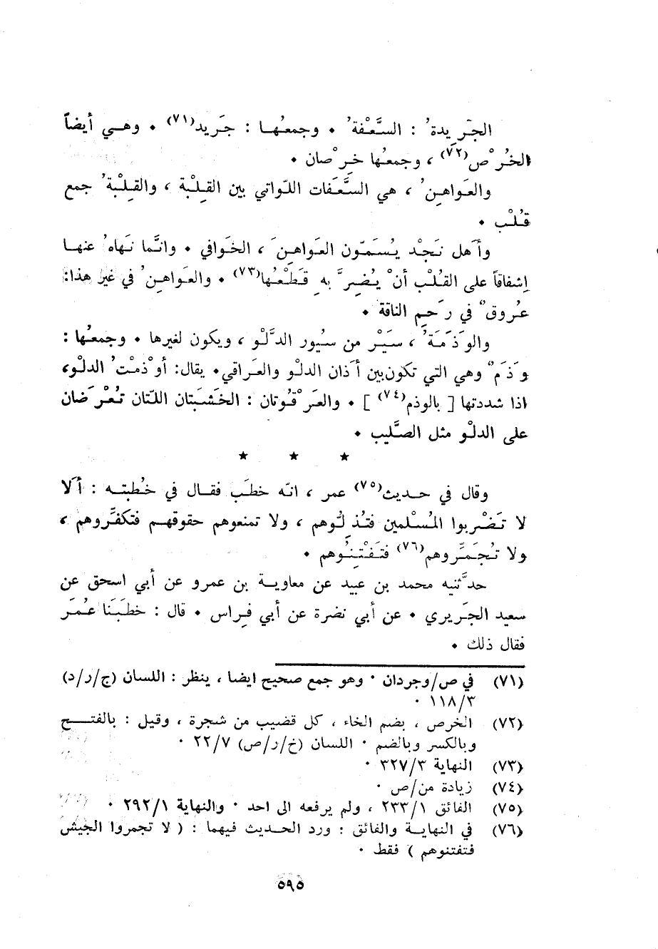 وَأهل نجد يسمون العواهن الخوافي وَإِنَّمَا نَهَاهُ عَنْهَا إشفاقا على الْقلب أَن يضر بِهِ قطعهَا والعواهن فِي غير هَذَا عروق فِي رحم النَّاقة