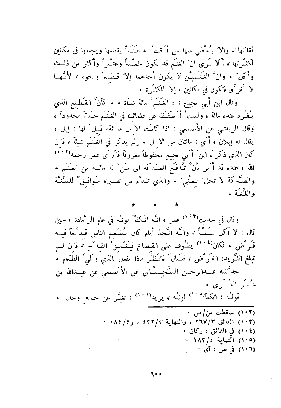 وَقَالَ ابْن أبي نجيح الْغنم مائَة شَاة كَأَن القطيع الَّذِي يفرد عِنْده مائَة وَلست أحفظ عَن عُلَمَائِنَا فِي الْغنم حدا محدودا وَقَالَ الرياشي عَن الْأَصْمَعِي إِذا كَانَت الْإِبِل مائَة قيل لَهَا إبل يُقَال لَهُ إبلان أَي مِائَتَان من الْإِبِل وَلم يذكر فِي الْغنم شَيْئا فَإِن كَانَ الَّذِي ذكره ابْن أبي نجيح مَحْفُوظًا مَعْرُوفا فَأرى عمر رَحمَه الله عِنْده قد أَمر بِأَن تدفع الصَّدَقَة إِلَى من لَهُ مائَة من الْغنم وَالصَّدَََقَة لَا تحل لَغَنِيّ وَالَّذِي تقدم من تفسيرنا مُوَافق للسّنة واللغة