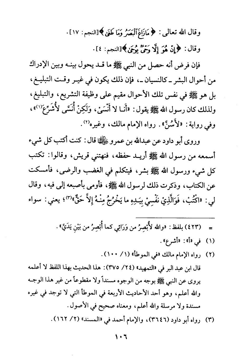 وروى أبو داود عن عبد الله بن عمرو - رضي الله عنه - قال: كنت أكتب كل شيء أسمعه من رسول الله - صلى الله عليه وسلم - أريد حفظه، فنهتني قريش، وقالوا: تكتب كل شيء ورسول الله - صلى الله عليه وسلم - بشر، فيتكلم في الغضب والرضى، فأمسكت عن الكتاب، وذكرت ذلك لرسول الله - صلى الله عليه وسلم -، فأومى بأصبعه إلى فيه، وقال لي: "اكْتُبْ، فَوَالَّذِيْ نَفْسِيْ بِيَدهِ ما يَخْرُجُ مِنْهُ إِلاَّ حَقٌّ" (¬3)؛ يعني: سواء