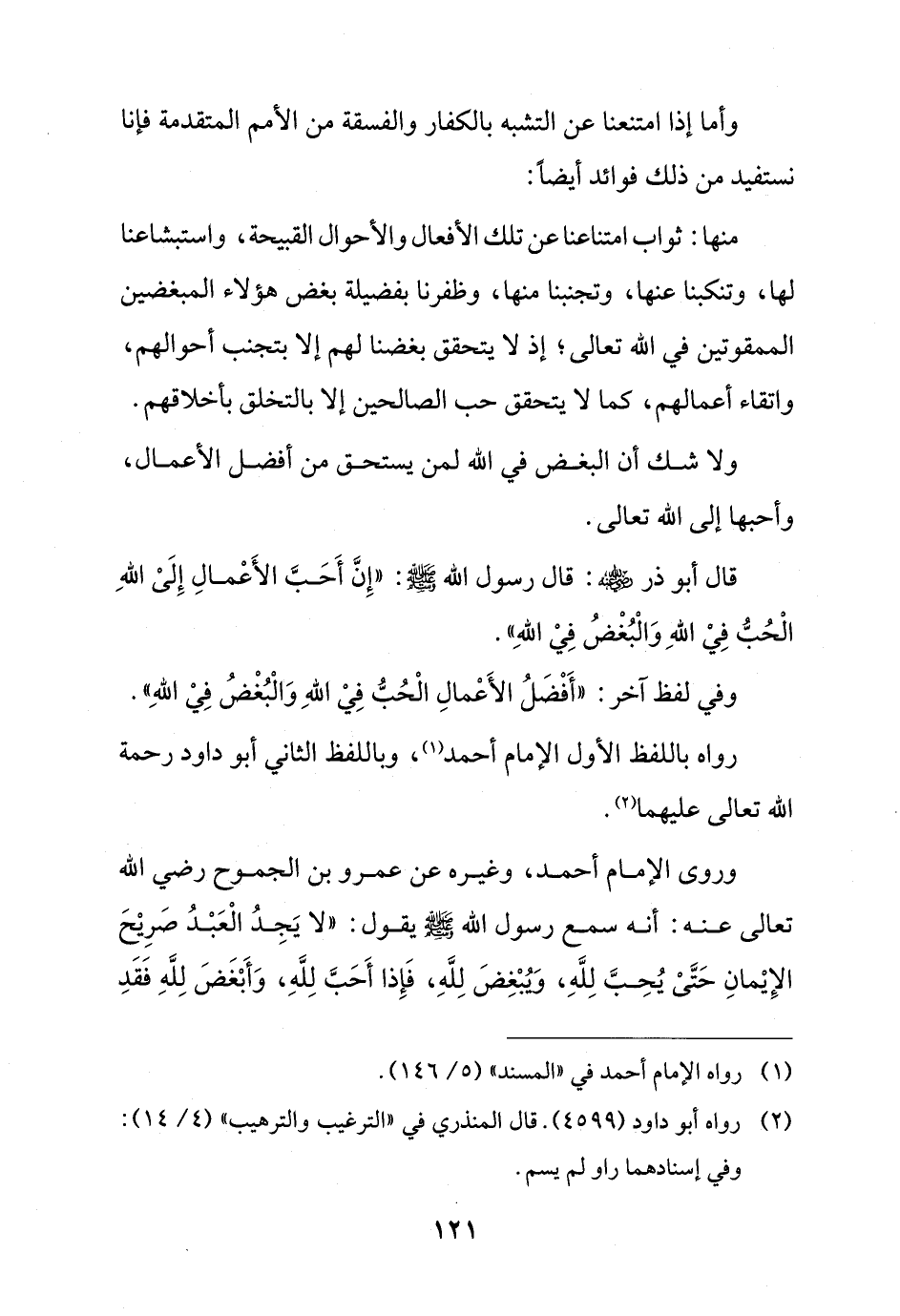 وفي لفظ آخر: "أَفْضَلُ الأَعْمالِ الْحُبُّ فِيْ اللهِ وَالْبُغْضُ فِيْ اللهِ".