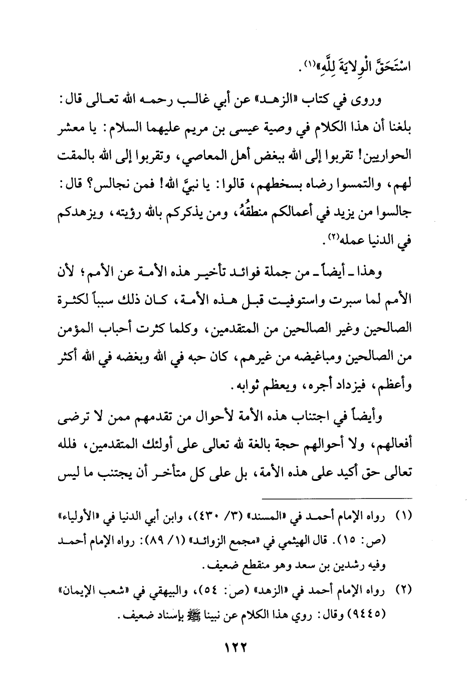 وأيضاً في اجتناب هذه الأمة لأحوال من تقدمهم ممن لا ترضى أفعالهم، ولا أحوالهم حجة بالغة لله تعالى على أولئك المتقدمين، فلله تعالى حق أكيد على هذه الأمة، بل على كل متأخر أن يجتنب ما ليس