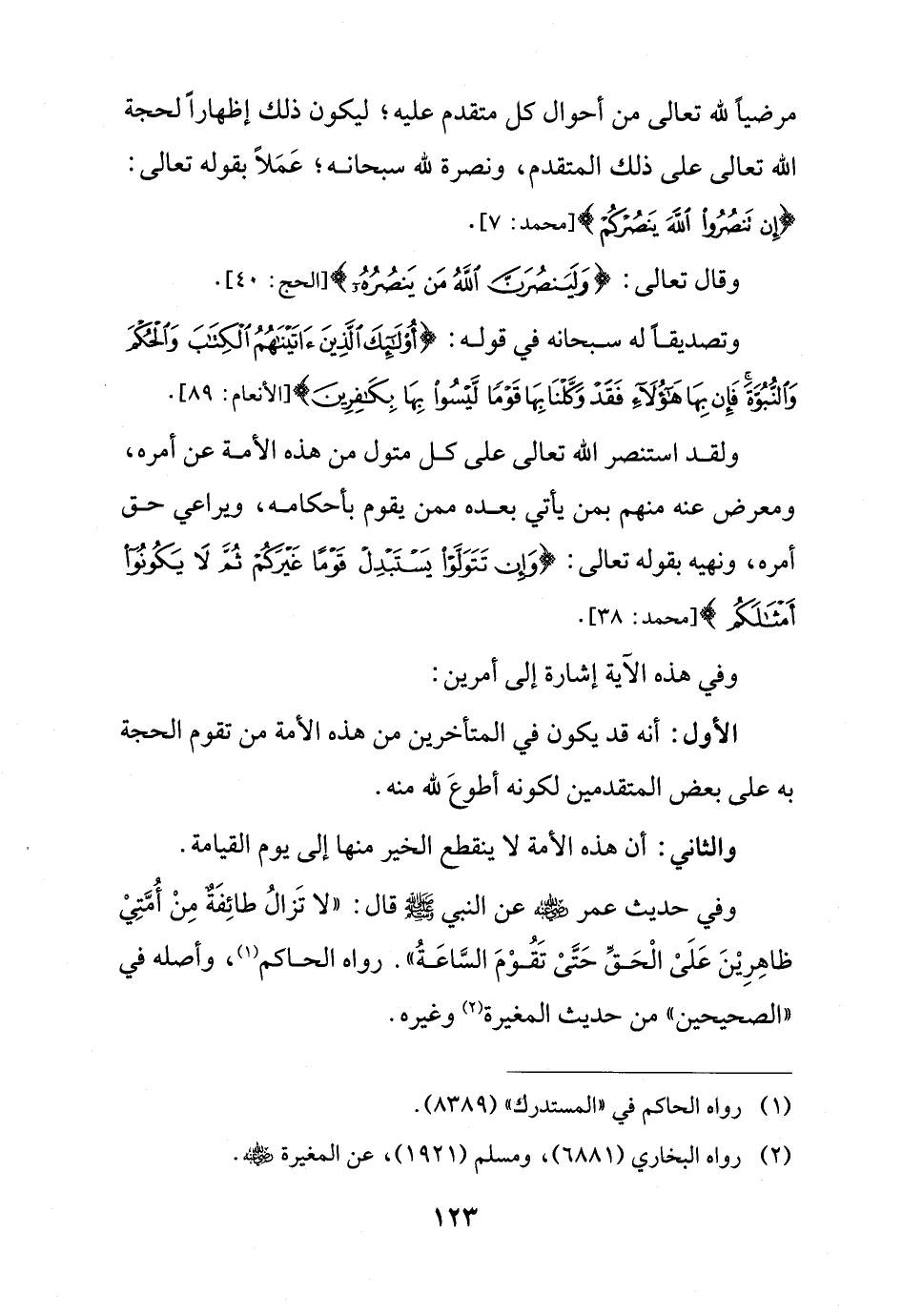 وفي حديث عمر - رضي الله عنه - عن النبي - صلى الله عليه وسلم - قال: "لا تَزالُ طائِفَةٌ مِنْ أُمَّتِيْ ظاهِرِيْنَ عَلَىْ الْحَقِّ حَتَىْ تَقُوْمَ السَّاعَة". رواه الحاكم (¬1)، وأصله في "الصحيحين" من حديث المغيرة (¬2) وغيره.