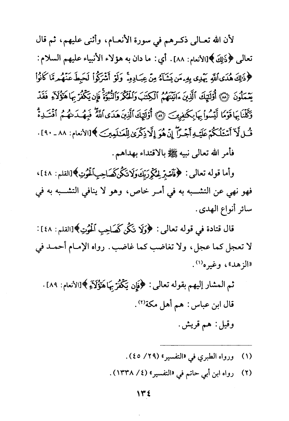 لأن الله تعالى ذكرهم في سورة الأنعام، وأثنى عليهم، ثم قال تعالى {ذَلِكَ} [الأنعام: 88] أي: ما دان به هؤلاء الأنبياء عليهم السلام: {ذَلِكَ هُدَى اللَّهِ يَهْدِي بِهِ مَنْ يَشَاءُ مِنْ عِبَادِهِ وَلَوْ أَشْرَكُوا لَحَبِطَ عَنْهُمْ مَا كَانُوا يَعْمَلُونَ (88) أُولَئِكَ الَّذِينَ آتَيْنَاهُمُ الْكِتَابَ وَالْحُكْمَ وَالنُّبُوَّةَ فَإِنْ يَكْفُرْ بِهَا هَؤُلَاءِ فَقَدْ وَكَّلْنَا بِهَا قَوْمًا لَيْسُوا بِهَا بِكَافِرِينَ (89) أُولَئِكَ الَّذِينَ هَدَى اللَّهُ فَبِهُدَاهُمُ اقْتَدِهْ قُلْ لَا أَسْأَلُكُمْ عَلَيْهِ أَجْرًا إِنْ هُوَ إِلَّا ذِكْرَى لِلْعَالَمِينَ} [الأنعام: 88 - 90].