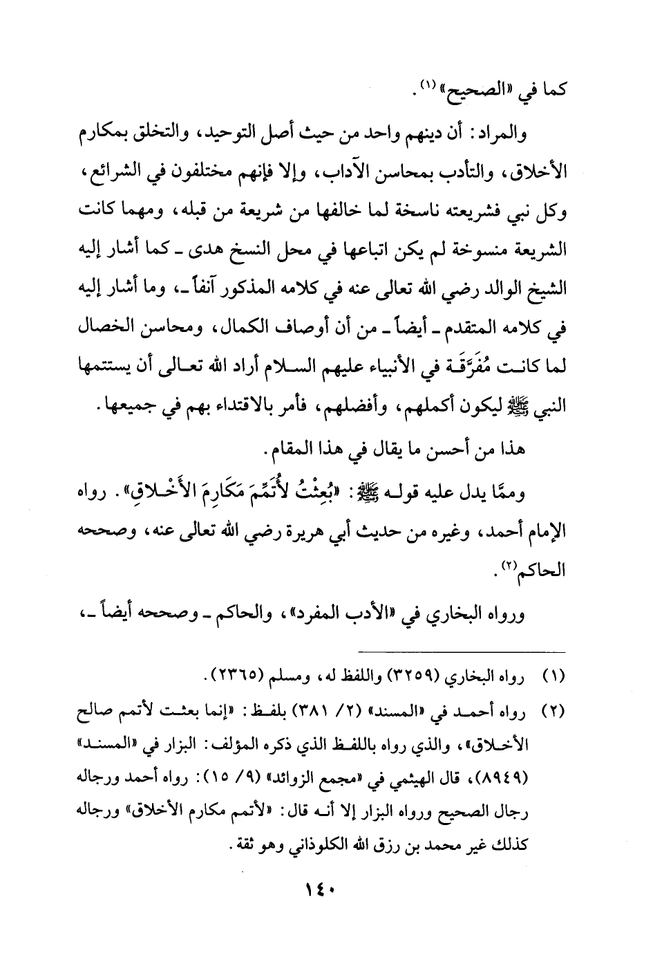 (¬2) رواه أحمد في "المسند" (2/ 381) بلفظ: "إنما بعثت لأتمم صالح الأخلاق"، والذي رواه باللفظ الذي ذكره المؤلف: البزار في "المسند" (8949)، قال الهيثمي في "مجمع الزوائد" (9/ 15): رواه أحمد ورجاله رجال الصحيح ورواه البزار إلا أنه قال: "لأتمم مكارم الأخلاق" ورجاله كذلك غير محمد بن رزق الله الكلوذاني وهو ثقة.