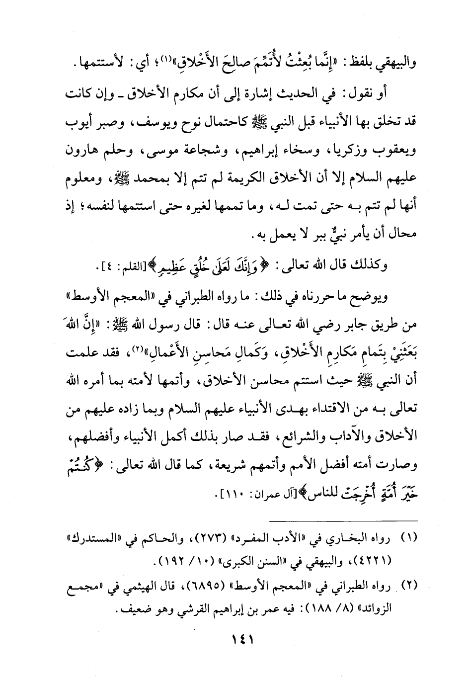 ويوضح ما حررناه في ذلك: ما رواه الطبراني في "المعجم الأوسط" من طريق جابر رضي الله تعالى عنه قال: قال رسول الله - صلى الله عليه وسلم -: "إِنَّ اللهَ بَعَثَنِيْ بِتَمامِ مَكارِمِ الأَخْلاقِ، وَكَمالِ مَحاسِنِ الأَعْمالِ" (¬2)، فقد علمت أن النبي - صلى الله عليه وسلم - حيث استتم محاسن الأخلاق، وأتمها لأمته بما أمره الله تعالى به من الاقتداء بهدى الأنبياء عليهم السلام وبما زاده عليهم من الأخلاق والآداب والشرائع، فقد صار بذلك أكمل الأنبياء وأفضلهم، وصارت أمته أفضل الأمم وأتمهم شريعة، كما قال الله تعالى: {كُنْتُمْ خَيْرَ أُمَّةٍ أُخْرِجَتْ لِلنَّاسِ} [آل عمران: 110].