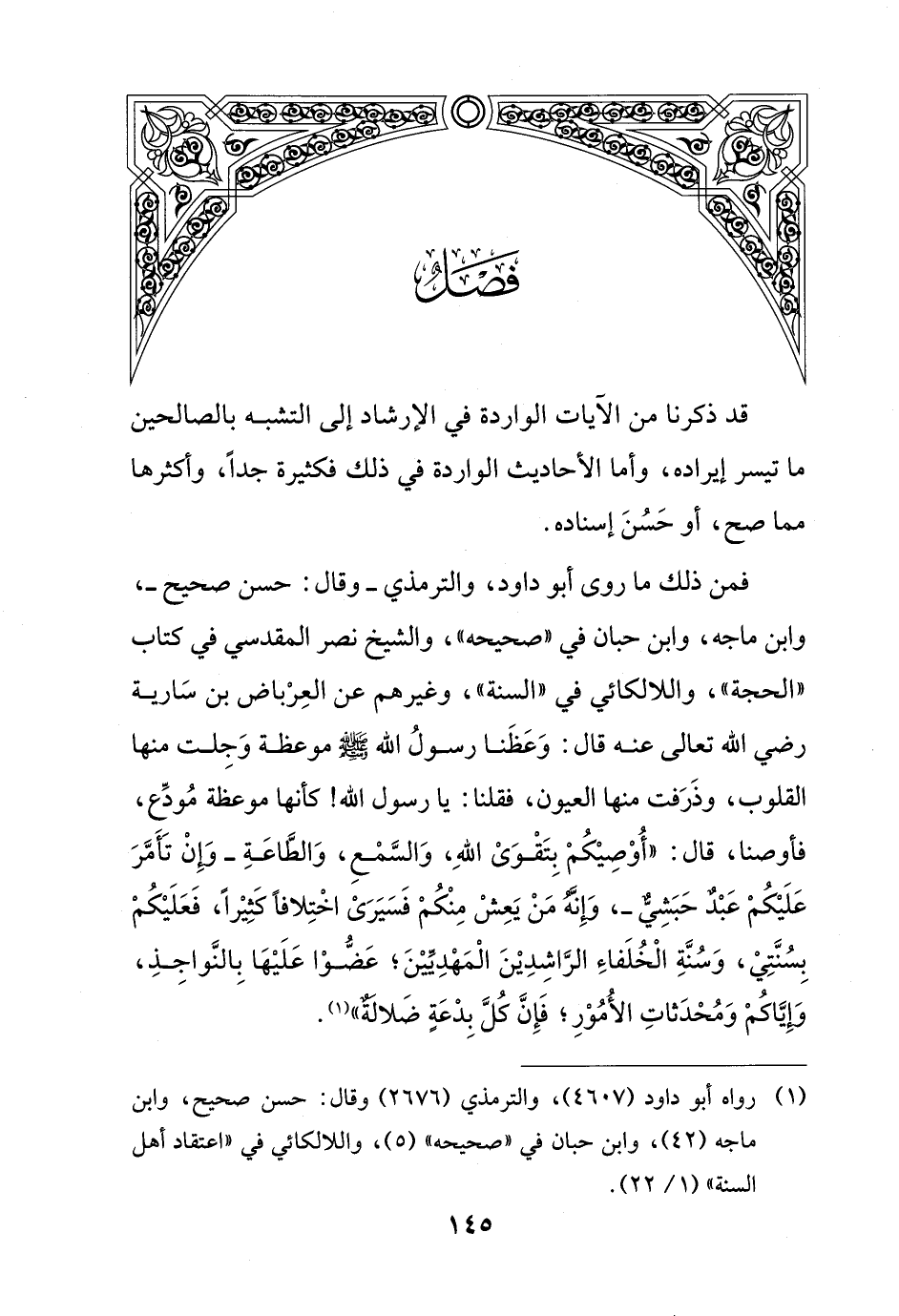 فمن ذلك ما روى أبو داود، والترمذي - وقال: حسن صحيح -، وابن ماجه، وابن حبان في "صحيحه"، والشيخ نصر المقدسي في كتاب "الحجة"، واللالكائي في "السنة"، وغيرهم عن العِرْباض بن سَارية رضي الله تعالى عنه قال: وَعَظَنا رسولُ الله - صلى الله عليه وسلم - موعظة وَجِلت منها القلوب، وذَرَفت منها العيون، فقلنا: يا رسول الله! كأنها موعظة مُودِّع، فأوصنا، قال: "أُوْصِيْكُمْ بِتَقْوَىْ اللهِ، وَالسَّمْعِ، وَالطَّاعَةِ - وإِنْ تأَمَّرَ عَلَيْكُمْ عَبْدٌ حَبَشِيٌّ -، وإنَّهُ مَنْ يَعِشْ مِنْكُمْ فَسَيَرَىْ اخْتِلافاً كَثِيْراً، فَعَلَيْكُمْ بِسُنَّتِيْ، وَسُنَّةِ الْخُلَفاءِ الرَّاشِدِيْنَ الْمَهْدِيِّيْنَ؛ عَضُّوْا عَلَيْهَا بِالنَّواجِذِ، وإيَّاكُمْ وَمُحْدَثاتِ الأُمُوْرِ، فَإِنَّ كُلَّ بِدْعَةٍ ضَلالَةٌ" (¬1).
