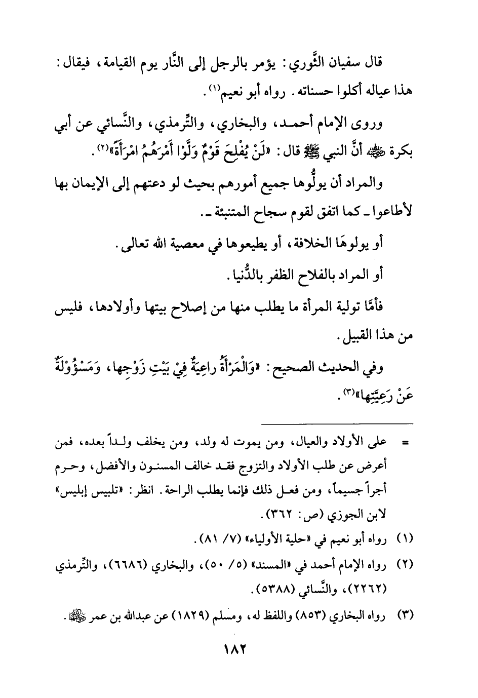 وروى الإمام أحمد، والبخاري، والتِّرمذي، والنَّسائي عن أبي بكرة - رضي الله عنه - أنَّ النبي - صلى الله عليه وسلم - قال: "لَنْ يُفْلِحَ قَوْم وَلَّوْا أَمْرَهُمُ امْرَأةً" (¬2).