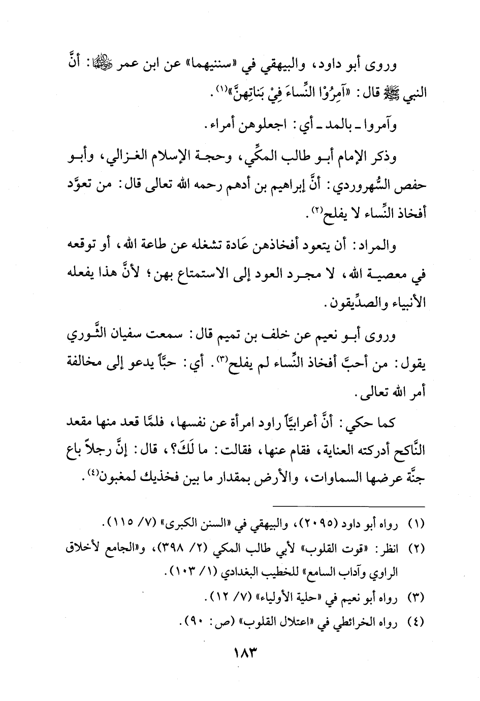وذكر الإِمام أبو طالب المكِّي، وحجة الإِسلام الغزالي، وأبو حفص السُّهروردي: أنَّ إبراهيم بن أدهم رحمه الله تعالى قال: من تعوَّد أفخاذ النِّساء لا يفلح (¬2).