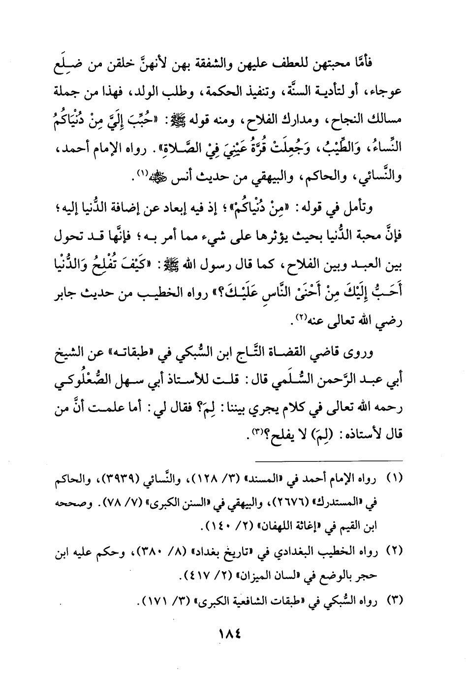 فأما محبتهن للعطف عليهن والشفقة بهن لأنهنَّ خلقن من ضِلَع عوجاء، أو لتأدية السنَة، وتنفيذ الحكمة، وطلب الولد، فهذا من جملة مسالك النجاح، ومدارك الفلاح، ومنه قوله - صلى الله عليه وسلم -: "حُبِّبَ إِليَ مِنْ دنيَاكُمُ النِّساءُ، وَالطيبُ، وَجُعِلَتْ قُرةُ عَيْنيَ فِيْ الصَّلاة". رواه الإِمام أحمد، والنَّسائي، والحاكم، والبيهقي من حديث أنس - رضي الله عنه - (¬1).
