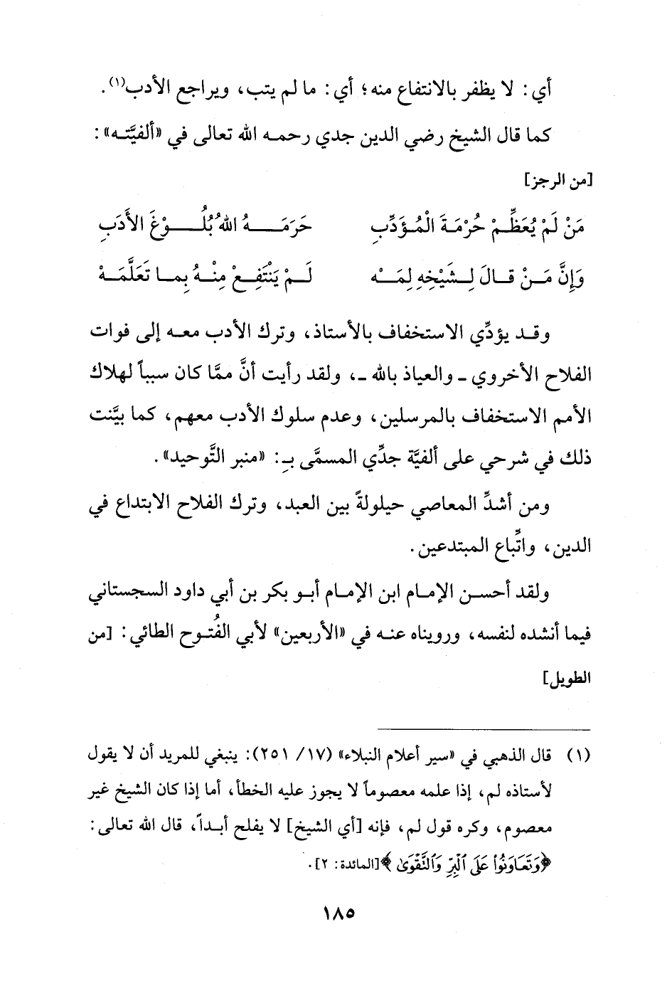 (¬1) قال الذهبي في "سير أعلام النبلاء" (17/ 251): ينبغي للمريد أن لا يقول لأستاذه لم، إذا علمه معصومًا لا يجوز عليه الخطأ، أما إذا كان الشيخ غير معصوم، وكره قول لم، فإنه [أي الشيخ] لا يفلح أبدًا، قال الله تعالى: {وَتَعَاوَنُوا عَلَى الْبِرِّ وَالتَّقْوَى} [المائدة: 2].