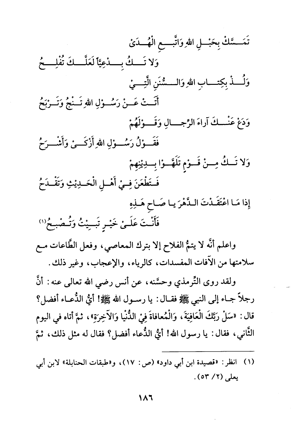 تَمَسَّكْ بِحَبْلِ الله وَاتَّبعِ الْهُدَىْ ... وَلا تَكُ بِدْعِيًّا لَعَلَّكَ تُفْلِحُ