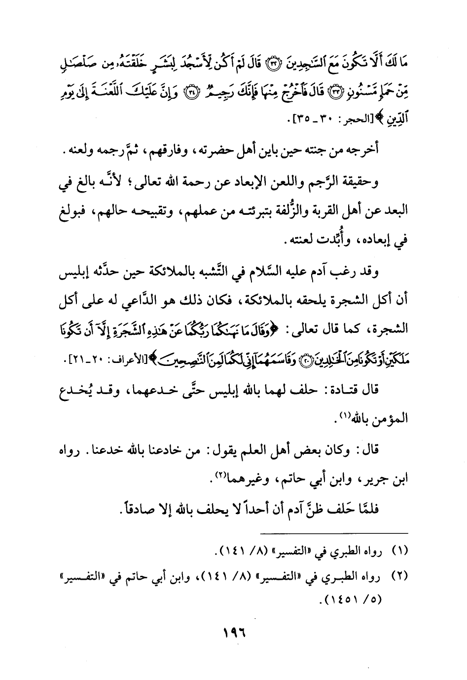 مَا لَكَ أَلَّا تَكُونَ مَعَ السَّاجِدِينَ (32) قَالَ لَمْ أَكُنْ لِأَسْجُدَ لِبَشَرٍ خَلَقْتَهُ مِنْ صَلْصَالٍ مِنْ حَمَإٍ مَسْنُونٍ (33) قَالَ فَاخْرُجْ مِنْهَا فَإِنَّكَ رَجِيمٌ (34) وَإِنَّ عَلَيْكَ اللَّعْنَةَ إِلَى يَوْمِ الدِّينِ} [الحجر: 30 - 35].