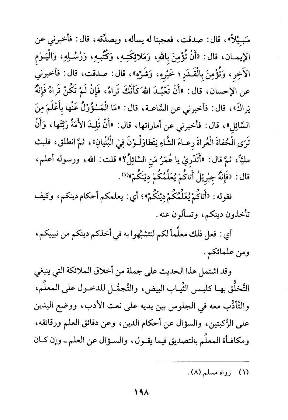 وقد اشتمل هذا الحديث على جملة من أخلاق الملائكة التي ينبغي التَّخلُّق بها كلبس الثّياب البيض، والتَّجمُّل للدخول على المعلِّم، والتَّادُّب معه في الجلوس بين يديه على نعت الأدب، ووضع اليدين على الرُّكبتين، والسؤال عن أحكام الدين، وعن دقائق العلم ورقائقه، ومكافأة المعلِّم بالتصديق فيما يقول، والسؤال عن العلم - وإن كان