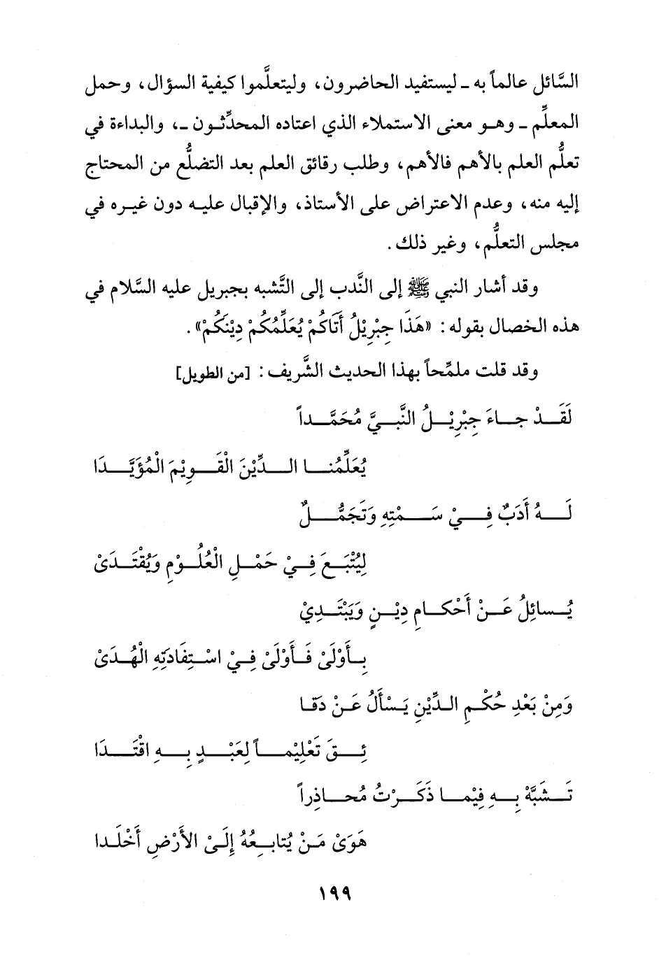 لَهُ أَدَبٌ فِيْ سَمْتِهِ وَتَجَمُّلٌ ... لِيُتْبَعَ فِيْ حَمْلِ الْعُلُوْمِ وَيُقْتَدَىْ