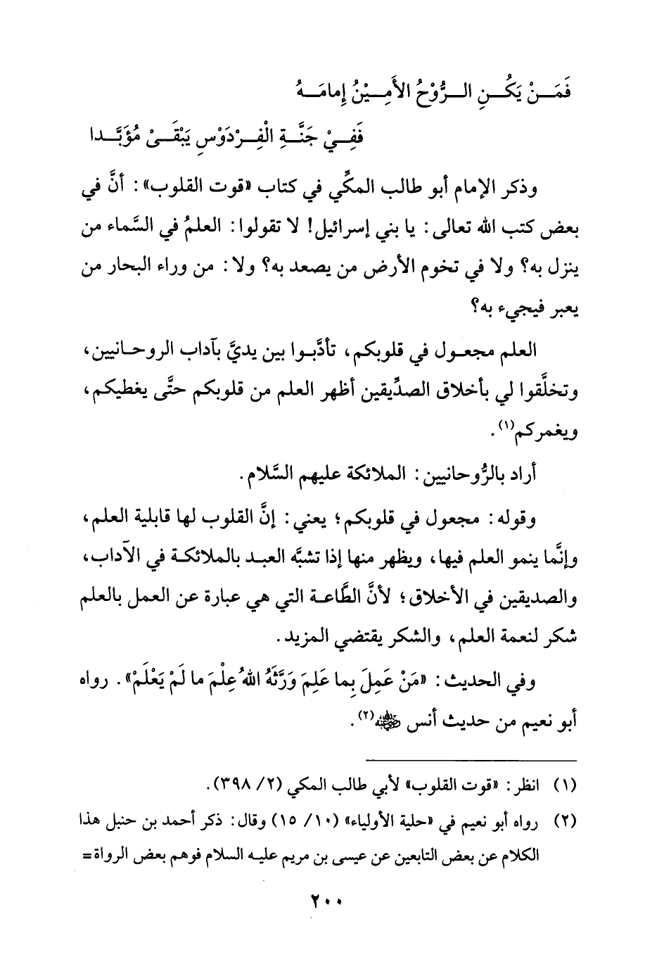 وذكر الإِمام أبو طالب المكي في كتاب "قوت القلوب": أنَّ في بعض كتب الله تعالى: يا بني إسرائيل! لا تقولوا: العلمُ في السَّماء من ينزل به؟ ولا في تخوم الأرض من يصعد به؟ ولا: من وراء البحار من يعبر فيجيء به؟