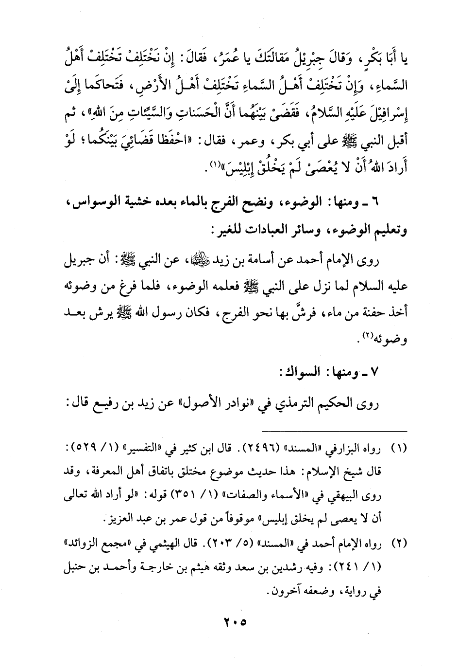 يا أَبَا بَكْرٍ، وَقالَ جِبْرِيْلُ مَقالتكَ يا عُمَرُ، فَقالَ: إِنْ نَخْتَلِفْ تَخْتَلِفْ أَهْلُ السَّماءِ، وإنْ تَخْتَلِفْ أَهْلُ السَّماءِ تَخْتَلِفْ أَهْلُ الأَرْضِ، فَتَحاكَما إِلَىْ إِسْرافِيْلَ عَلَيْهِ السَّلامُ، فَقَضَىْ بَيْنَهُما أَنَّ الْحَسَناتِ وَالسَّيئاتِ مِنَ اللهِ"، ثم أقبل النبي - صلى الله عليه وسلم - على أبي بكر، وعمر، فقال: "احْفَظا قَضَائِيَ بَيْنَكُما، لَوْ أَرادَ اللهُ أَنْ لا يُعْصَىْ لَمْ يَخْلُقْ إِبْلِيْسَ" (¬1).