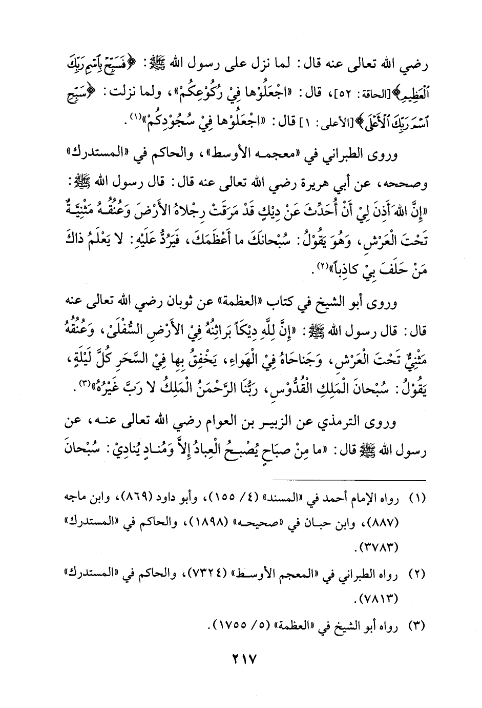 رضي الله تعالى عنه قال: لما نزل على رسول الله - صلى الله عليه وسلم -: {فَسَبِّحْ بِاسْمِ رَبِّكَ الْعَظِيمِ} [الحاقة: 52]، قال: "اجْعَلُوْها فِيْ رُكُوْعِكُمْ"، ولما نزلت: {سَبِّحِ اسْمَ رَبِّكَ الْأَعْلَى} [الأعلى: 1] قال: "اجْعَلُوْها فِيْ سُجُوْدِكُمْ" (¬1).