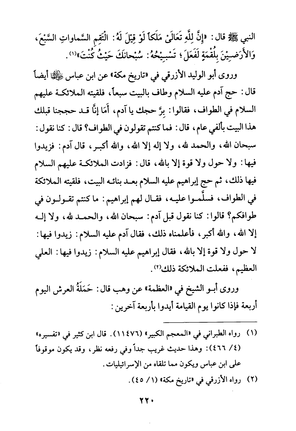 وروى أبو الوليد الأزرقي في "تاريخ مكة" عن ابن عباس - رضي الله عنهما - أيضًا قال: حج آدم عليه السلام وطاف بالبيت سبعا، فلقيته الملائكة عليهم السلام في الطواف، فقالوا: بِرَّ حجك يا آدم، أَمَا إنَّا قد حججنا قبلك هذا البيت بألفي عام، قال: فما كنتم تقولون في الطواف؟ قال: كنا نقول: سبحان الله، والحمد لله، ولا إله إلا الله، والله أكبر، قال آدم: فزيدوا فيها: ولا حول ولا قوة إلا بالله، قال: فزادت الملائكة عليهم السلام فيها ذلك، ثم حج إبراهيم عليه السلام بعد بنائه البيت، فلقيته الملائكة في الطواف، فسلَّموا عليه، فقال لهم إبراهيم: ما كنتم تقولون في طوافكم؟ قالوا: كنا نقول قبل آدم: سبحان الله، والحمد لله، ولا إله إلا الله، والله أكبر، فأعلمناه ذلك، فقال آدم عليه السلام: زيدوا فيها: لا حول ولا قوة إلا بالله، فقال إبراهيم عليه السلام: زيدوا فيها: العلي العظيم، ففعلت الملائكة ذلك (¬2).