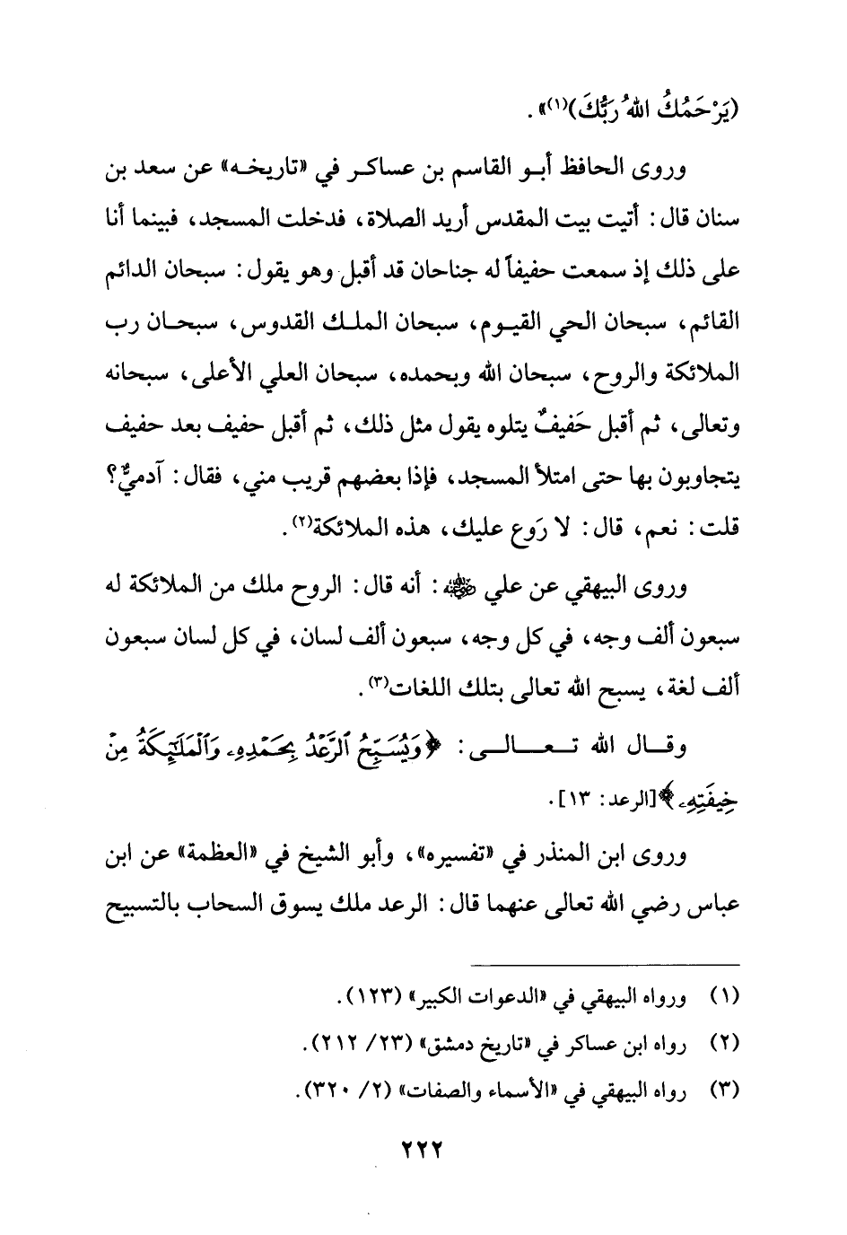 وروى الحافظ أبو القاسم بن عساكر في "تاريخه" عن سعد بن سنان قال: أتيت بيت المقدس أريد الصلاة، فدخلت المسجد، فبينما أنا على ذلك إذ سمعت حفيفًا له جناحان قد أقبل -وهو يقول: سبحان الدائم القائم، سبحان الحي القيوم، سبحان الملك القدوس، سبحان رب الملائكة والروح، سبحان الله وبحمده، سبحان العلي الأعلى، سبحانه وتعالى، ثم أقبل حَفيفٌ يتلوه يقول مثل ذلك، ثم أقبل حفيف بعد حفيف يتجاوبون بها حتى امتلأ المسجد، فإذا بعضهم قريب مني، فقال: آدميٌّ؟ قلت: نعم، قال: لا رَوع عليك، هذه الملائكة (¬2).